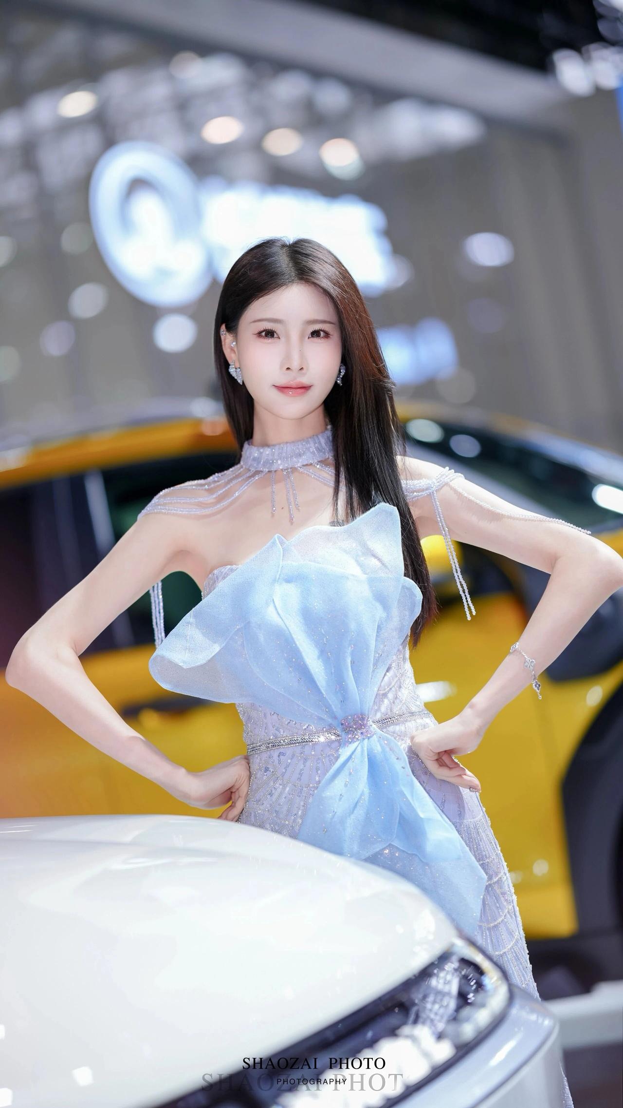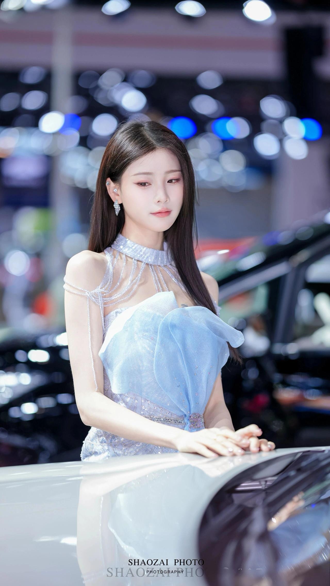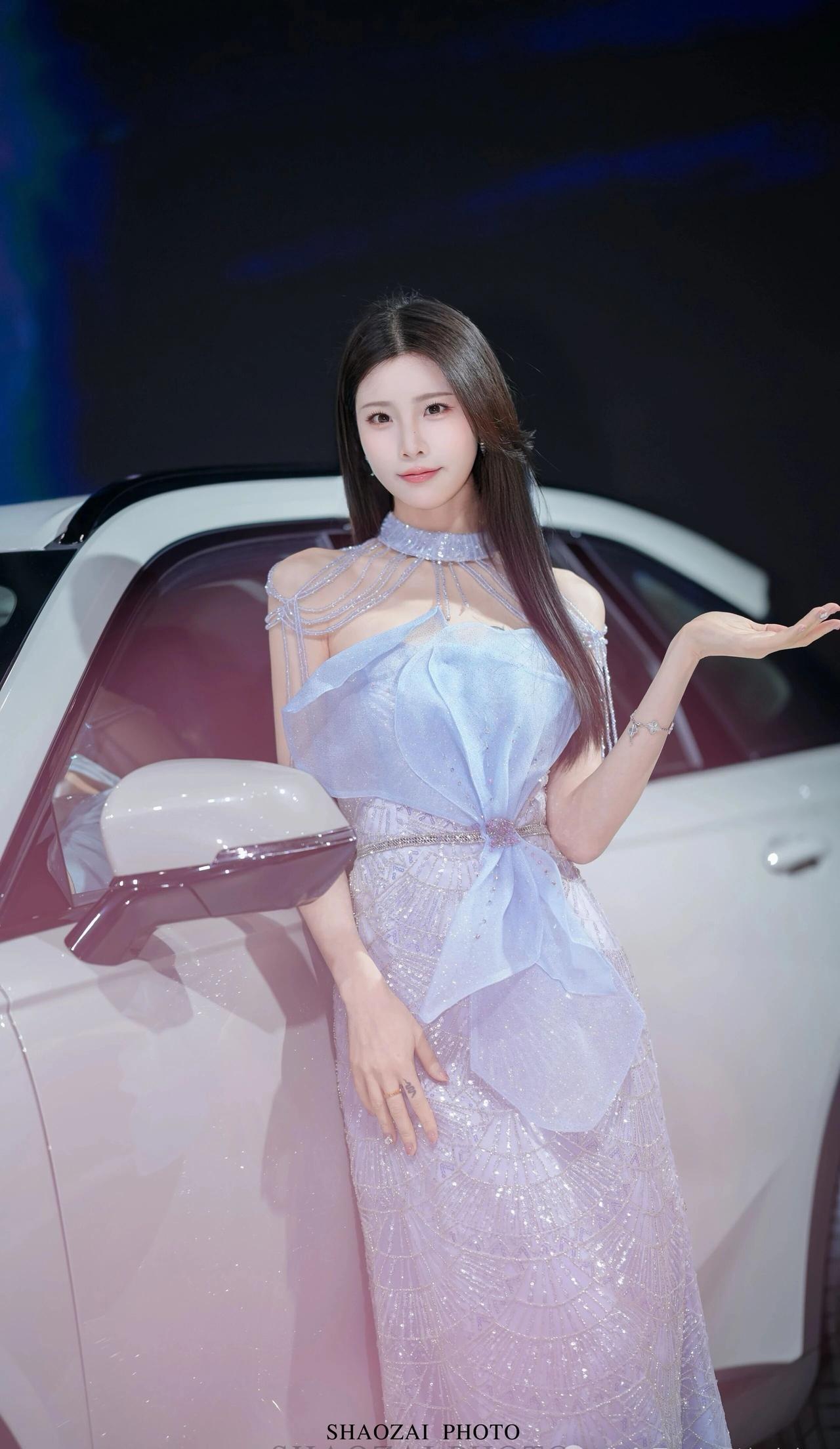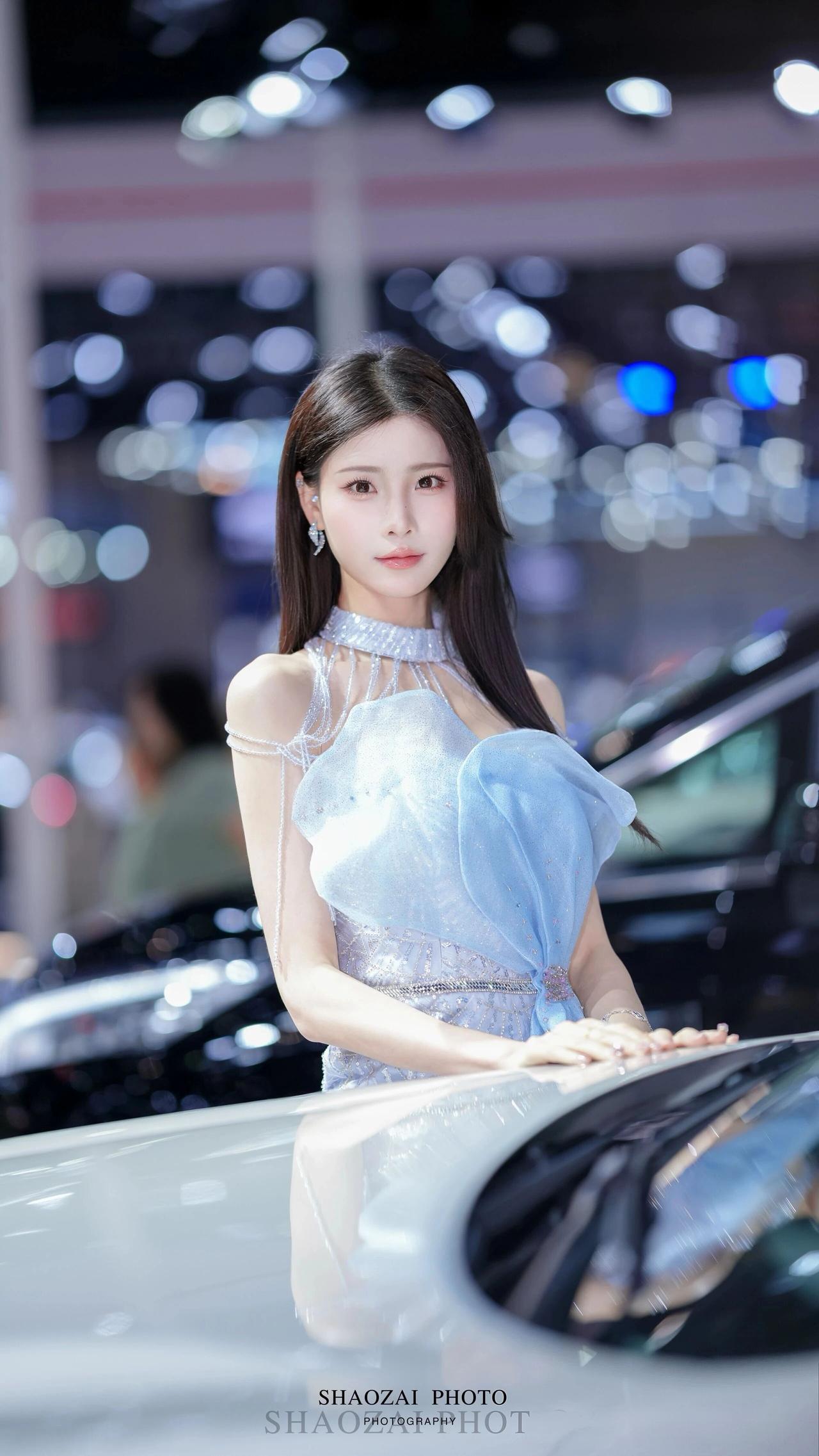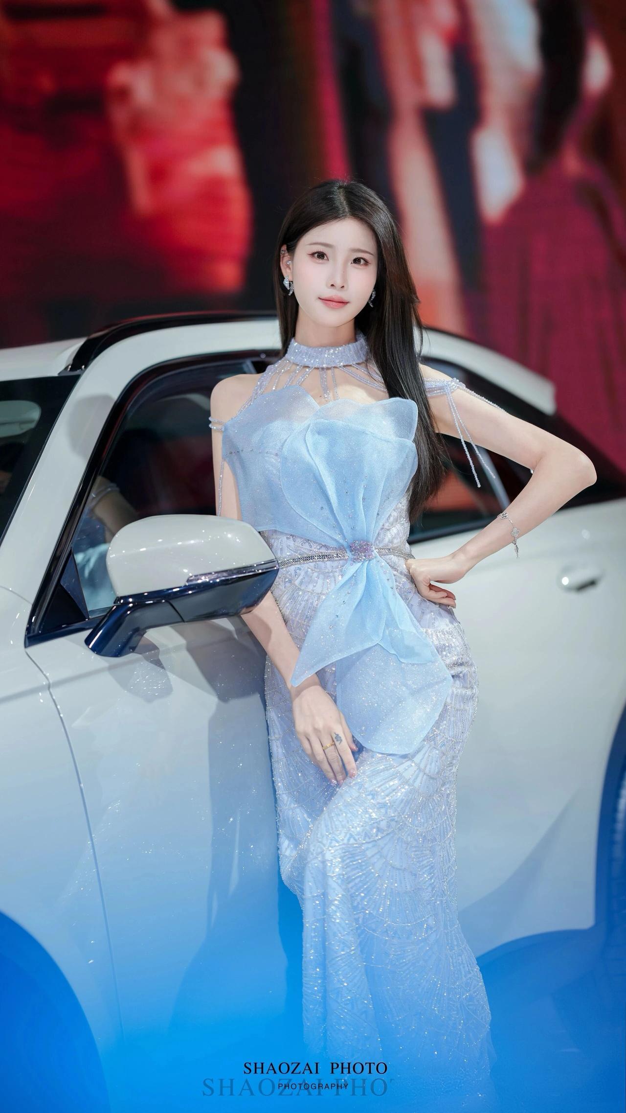 身姿纤秾合度,长发垂顺柔润,眉眼清透温婉,时而优雅倚车、时而灵动比心,自带温柔氛围感。蓝纱与亮白车身相映,一颦一笑都尽显温婉精致,是车展里温柔又耀眼的存在。