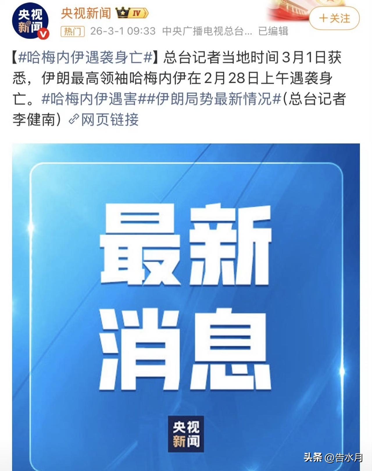 这也太菜了吧!伊朗昨天晚上说哈梅内伊没事儿,今天就说人昨天上午就没了! 而且回回都是美以先确定消息,这给人的感觉就是哈梅内伊身边全是报点的内线,他在哪他在干什么完全是对美以单向透明的,这还打个毛? 最抽象的就是说哈梅内伊还是在他家里被炸没了,合着外头锣鼓喧天噼里啪啦他自己屁股都不肯挪一下?