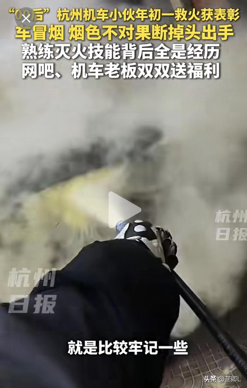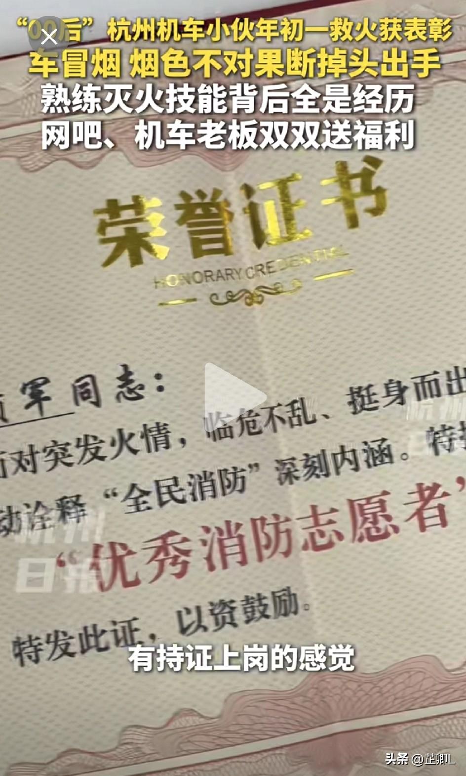 后续来了……杭州00后小伙,大年初一骑车遇车辆自燃,冲进网吧拎灭火器硬核灭火,全网狂赞4000万次! 大年初一的杭州街头,00后小伙楼质军的一个举动,让全网直呼“太帅了”! 当天他骑摩托车出门,刚开没多久就发现路边一辆私家车冒起了灰烟,越看越不对劲,立马掉头往回冲。 他二话不说扎进路边网吧,大喊“外面车着火了”,熟门熟路拎起前台灭火器,拔栓、摇晃、对准缝隙喷射,一套动作行云流水。 朋友也赶紧拿灭火器支援,热心路人也纷纷上手,几个人齐心协力跟火势较劲。 就在他换第二瓶灭火器,想掀引擎盖进一步灭火时,明火突然蹿了出来,他临危不乱继续喷射,短短几分钟,消防车就呼啸赶到,后续处置交给消防员后,他才悄悄离开。 这段灭火视频被他发到网上,直接火了! 近4000万网友围观,百万点赞刷屏,就连央视新闻、新华社官媒都纷纷转载,大家都夸“00后有事是真上”“机车侠太靠谱了”。 有人注意到他用灭火器的操作特别专业,楼质军笑着说,单位常搞消防演习,这都是“基本操作”,再加上小时候玩爆竹点着稻草堆挨过揍,打那以后对消防的事就特别上心。 火遍全网后,摩托车厂家给他送了终身免费置换权益,网吧老板给他终身上网打折。2月27日,杭州消防还专门给他送去了“优秀消防志愿者”证书,表彰他的勇敢和果断。 面对荣誉,楼质军反倒有些不好意思,还坦言当时想掀引擎盖的操作其实不安全,多亏网友提醒,也借这事提醒大家,遇到车辆自燃,千万别急着开引擎盖,先从缝隙喷灭火器,及时报警才是关键。 一场突发的火情,让我们看到了00后的担当,也看到了普通人之间的暖心相助,为楼质军,也为所有热心人点赞! 就像一条高赞评论所讲,“视频里包含了见义勇为的骑手、常备消防器材的网吧、迅速响应的消防员、拔刀相助的围观群众。” 这大概就是人间大爱的模样吧!为每一位仗义出手的人点赞👍👍👍 素材来源:杭州日报,侵联删!