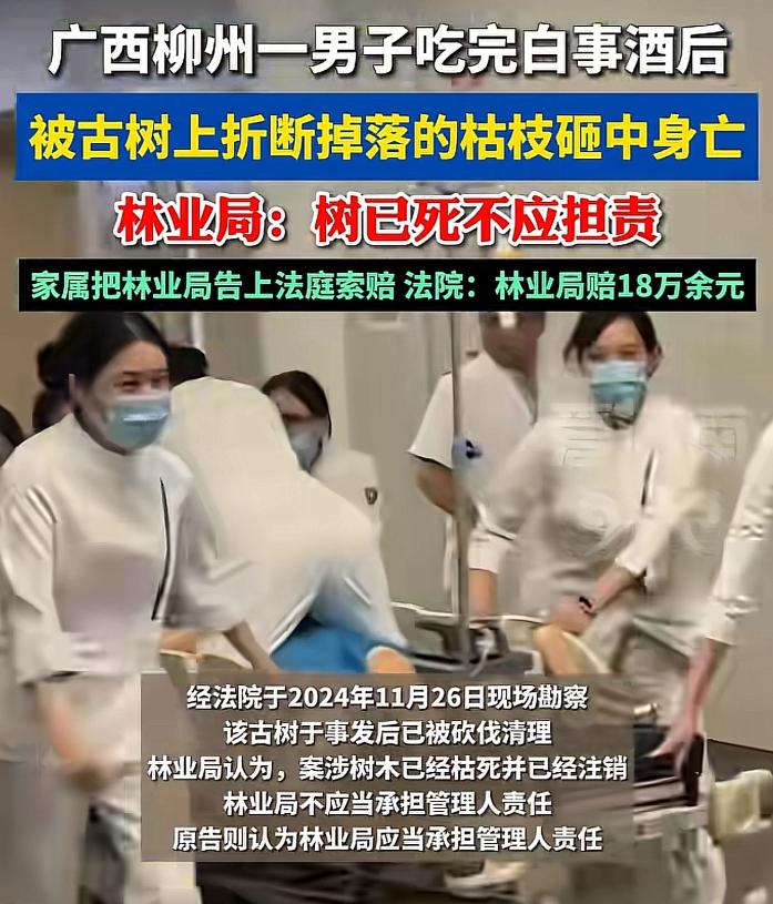 冤吗?柳州男子白事酒后被古树砸死,林业局说树已注销无责,法院终判! 家人们,你们敢信吗?广西柳州这场悲剧,真的越看越让人揪心,到底谁该为一条人命买单,看完你就有答案了。 事情就发生在2024年6月21号傍晚,柳州融安县一个村子里,村民黄某祥刚参加完同村的白事,喝了点酒往家走。 走到屯里一处平地,靠近一棵老枫树旁边时,意外突然发生——树上一根枯枝突然折断掉落,不偏不倚砸中他的头部。 送到医院后,还是没救回来,最终因为颅脑损伤不幸去世。好好一个人,参加完白事却没能回家,家属哭得肝肠寸断,换谁都接受不了。 悲痛过后,家属一纸诉状把两个人告上了法庭,一个是这棵古树的所有人,也就是村里的村民小组,另一个是当地林业局。 这下两边都喊冤,各说各的理,场面一下子僵住了。古树所有人这边,觉得自己特别委屈。他们说,这棵枫香树已经有160年树龄,早就成了古树,之前就有过枯枝掉落砸中村民房屋的事。 他们早就发现这树有安全隐患,也已经及时向林业局报告,请求处理了。在他们看来,自己已经尽到了该尽的义务,责任根本不在自己,该找林业局算账才对。 紧接着,林业局这边也给出了说法,态度很明确:这棵树已经枯死,而且他们早就在系统里把这棵古树注销了,所以林业局不再承担管理人责任,这事跟他们没关系。 一边说报过告该找林业局,一边说树已注销不担责,到底谁在理?法院最终的判决,给出了明确答案。 先跟大家说清楚这棵树的情况,这棵160年的枫香树,2018年就被林业局挂了古树保护牌,明确由林业局负责保护管理,这是有法规依据的。 2024年4月,村里发现树枯了,还砸过房子,村委就赶紧向乡里的林业站报告,之后林业站也上报给了县林业局。 当年5月,村委填了古树死亡确认书上报,林业局5月底就审核通过,在系统里注销了这棵古树。但关键问题来了,注销之后,他们啥也没做。 既没把注销的消息告诉村里、乡里,也没摘除树上的保护牌,更没采取任何排险措施,比如修剪枯枝、清理危树,就这么放任不管。直到6月21号黄某祥出事,这棵树的保护牌还挂在上面,枯枝也一直没处理,最终酿成了悲剧。 法院审理后认为,根据法律规定,林木折断致人损害,所有人或管理人不能证明自己没过错,就要承担侵权责任。 村民小组作为古树所有人,确实有一定的管护义务,要承担30%的责任。但更关键的是林业局,他们的过错更大。 虽说林业局在系统里注销了古树,但这只是他们内部的操作,没对外公示,也没通知相关方,外面的人根本不知道这树已经“被注销”。 而且他们早就知道这棵树有安全隐患,接到报告后没采取任何有效措施,注销后也没排除危险,管护责任根本没消失。 所以法院一审判决,林业局承担70%的主要责任,赔偿家属死亡赔偿金、丧葬费、精神抚慰金等,一共18万多,村民小组不承担赔偿,驳回家属其他诉求。林业局不服,提起上诉,结果柳州市中级人民法院驳回上诉,维持原判,现在案件已经生效。 可能有人会问,树都死了还注销了,林业局真的该担责吗?其实答案很简单,管护责任不是一句“注销”就能免除的。 古树是国家重点保护的,林业局作为法定管护部门,不管树活没活,只要没彻底消除安全隐患,没让相关方知道注销情况,就不能免责。 说白了,不是注销了就万事大吉,只要危险还在,责任就还在。村里虽然报了告,但作为所有人,也有提醒和配合管护的义务,承担小部分责任也合理。 一场意外,夺走一条人命,背后是责任的缺失。希望这件事能给所有相关部门提个醒,管护不是走过场,每一个隐患都可能酿成无法挽回的悲剧。 最后想问大家,你们觉得这个判决合理吗?林业局到底冤不冤?评论区说说你的看法!
