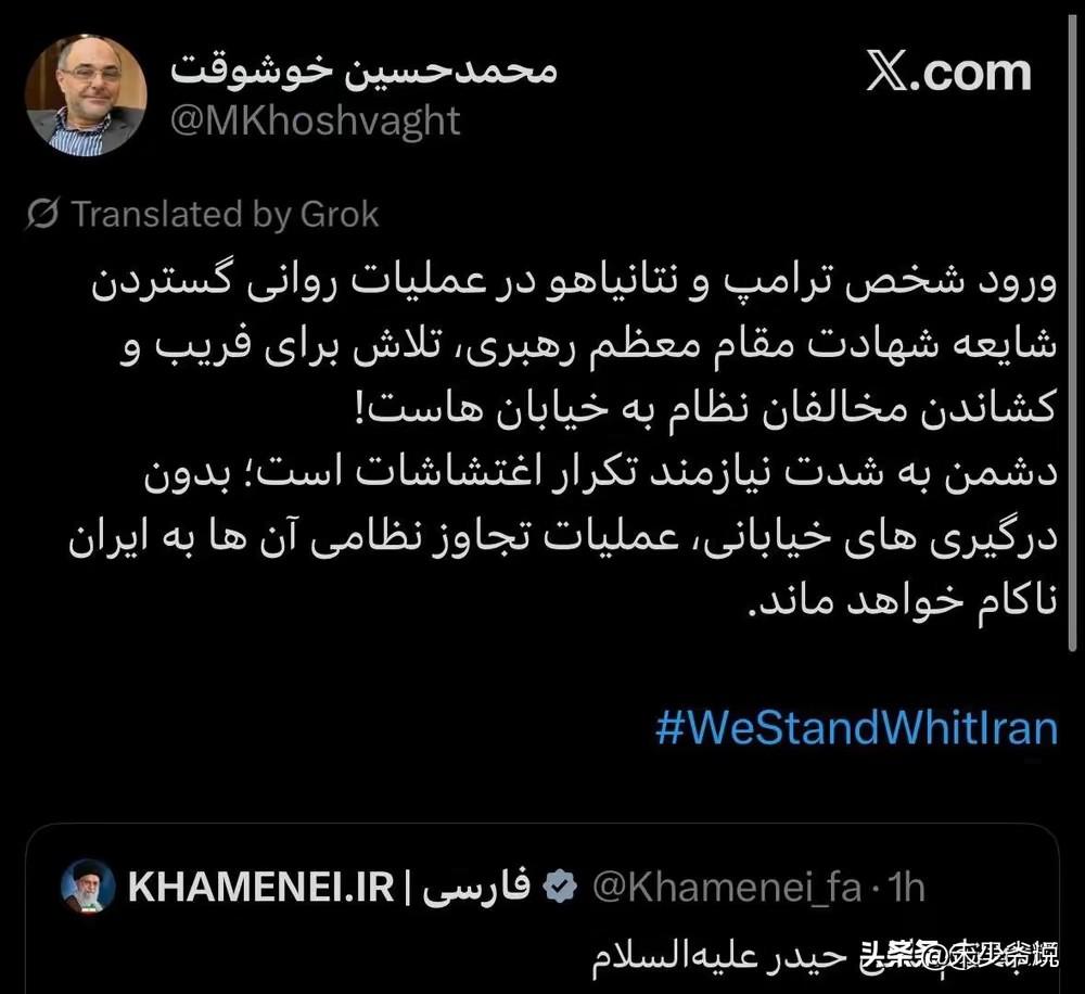 哈梅内伊女婿在社交平台发文称“哈梅内伊遇害是假消息” 此前被传已经在昨天袭击中遇难的哈梅内伊女婿在社交平台发文称“哈梅内伊遇害是特朗普与内塔尼亚胡散布假消息的心理战”。 而此前伊朗官方刚刚宣布,哈梅内伊已经遇害,全国哀悼40天。