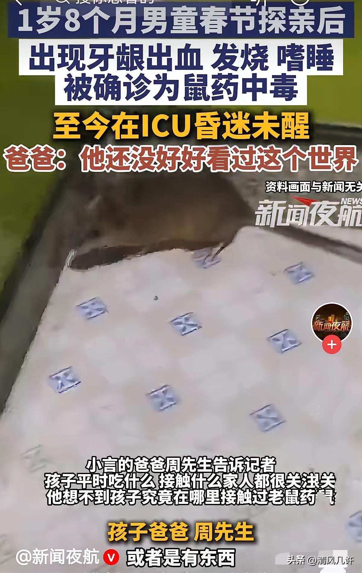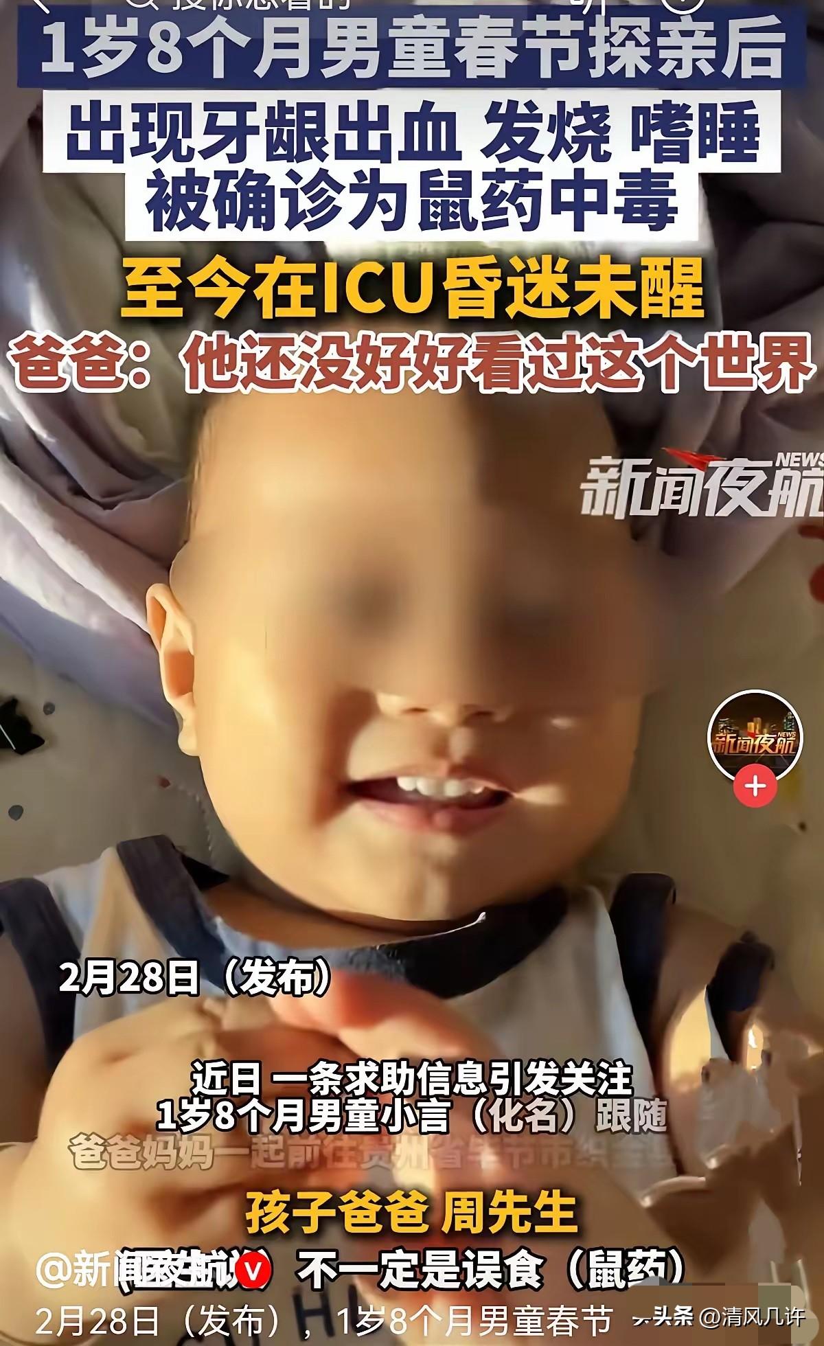“太蹊跷了!”贵州毕节,夫妻俩带着1岁8个月的儿子去走亲戚,回来几天后,儿子就牙龈出血,发烧嗜睡,他们以为儿子感冒,给吃了点感冒药,可越发严重,赶紧去了医院。谁知被确诊鼠药中毒,直接进了ICU,靠呼吸机续命。巨大的治疗费压的他们喘不过气来。男子崩溃了:我儿子还没好好看过这个世界,不能眼睁睁看着他离开!哪怕有一丝希望也不放弃!网友:1岁多孩子,根本不能离开大人视线!没那么简单,报警吧! 孩子名叫小言,是全家人小心翼翼呵护长大的宝贝,父母平时对他的饮食起居和接触物品格外上心,谁也没能料到,一次再平常不过的探亲,会把孩子推到生死关口。 从亲戚家返回后的几天里,小言先出现牙龈出血的情况,家长只当是幼儿出牙期的常见状况,没有往更严重的方向多想。孩子紧接着发起高烧,整天昏昏沉沉提不起精神,家长喂服感冒药后症状没有缓解,身体状态反而一天比一天差。 夫妻两人越看越心慌,不敢再耽误片刻,立刻带孩子赶往医院检查。 当地医院无法判定病因,只能建议紧急转往上级医疗机构。专业的毒物检测结果出来的那一刻,整个家庭都被击垮,小言被确诊为抗凝血类鼠药中毒,这种毒物会直接破坏人体凝血功能,引发全身性出血,对低龄幼儿的伤害具备致命性。 孩子的病情快速恶化,颅内出血、中枢性呼吸衰竭等多项并发症接连出现,医院当场下达病危通知,将小言送进ICU,只能依靠呼吸机维持基本生命体征。 小言的父母都是普通务工者,收入仅够支撑日常家用,根本没有应对重大疾病的储备资金。 ICU的治疗费用单日开销巨大,家里的积蓄很快耗尽,亲戚朋友凑来的钱,在持续的救治面前也撑不了多久。经济上的绝境和对孩子的担忧,把这对年轻父母压得喘不过气,他们日夜守在ICU门外,不敢有一秒离开,生怕错过关于孩子的任何消息。 孩子父亲面对外界求助时,情绪几乎崩溃。他说小言平时最清晰、最常喊的就是爸爸妈妈,孩子还没有好好认识这个世界,他做不到眼睁睁看着孩子离开,只要还有一丝救治可能,他都不会放手。这份为人父母的倔强与无助,隔着屏幕都能让人感受到锥心的难过。 网友的提醒并非多余,一岁八个月的孩子行动范围有限,自主接触到鼠药的可能性极低,毒物来源充满疑点。 父母仔细回想探亲期间的全部行程,孩子去过亲戚家中,也在周边公共场所停留过,所有到过的地方都没有发现鼠药痕迹,也没有相关人员承认放置过违禁毒物,毒源的追查迟迟没有进展。 当地警方接到线索后已经全面介入,对孩子接触过的所有场地逐一排查,固定相关证据,全力还原孩子接触毒物的过程与途径,希望尽快查清事实,给这个备受打击的家庭一个明确结果。 走投无路的父亲在网络平台发起治疗求助,目标筹集三十万元救治费用。 消息传开后,大量网友伸出援手,上千位爱心人士陆续捐款,每一笔善意都在为这个小生命争取生机。父亲郑重承诺,只要孩子能平安挺过难关,全家人会用往后的日子传递温暖,回报所有伸出援手的陌生人。 医护人员介绍,鼠药中毒给幼儿带来的身体损伤范围广、恢复难度大,后续不仅要面对并发症的持续风险,还要经历漫长的康复周期。小言始终处于昏迷状态,还没有脱离生命危险,医疗团队没有停下抢救的脚步,全力守护这个年幼的生命。 这件事也给所有家庭敲响警钟,低龄幼儿的安全防护没有任何侥幸空间,陌生环境里的潜在隐患难以预判,全程看护、及时排查,才能最大限度降低意外风险。违禁鼠药的生产、销售与存放管理,同样需要更严格的规范,避免再有无辜孩子受到无妄伤害。 孩子是一个家庭的全部希望,突如其来的意外让人无力抵抗,大家都在期盼小言能早日苏醒、脱离危险,期盼真相尽快水落石出,更期盼每个年幼的生命都能被稳稳守护,平安长大。 各位读者你们怎么看?欢迎在评论区讨论。