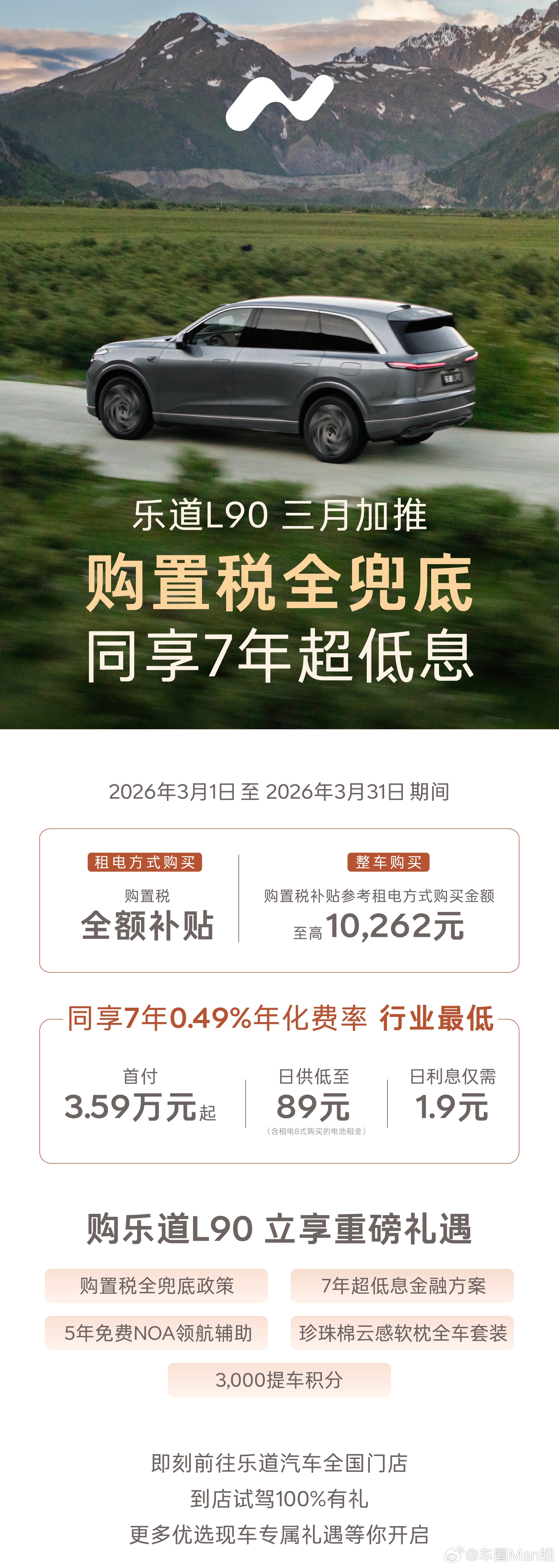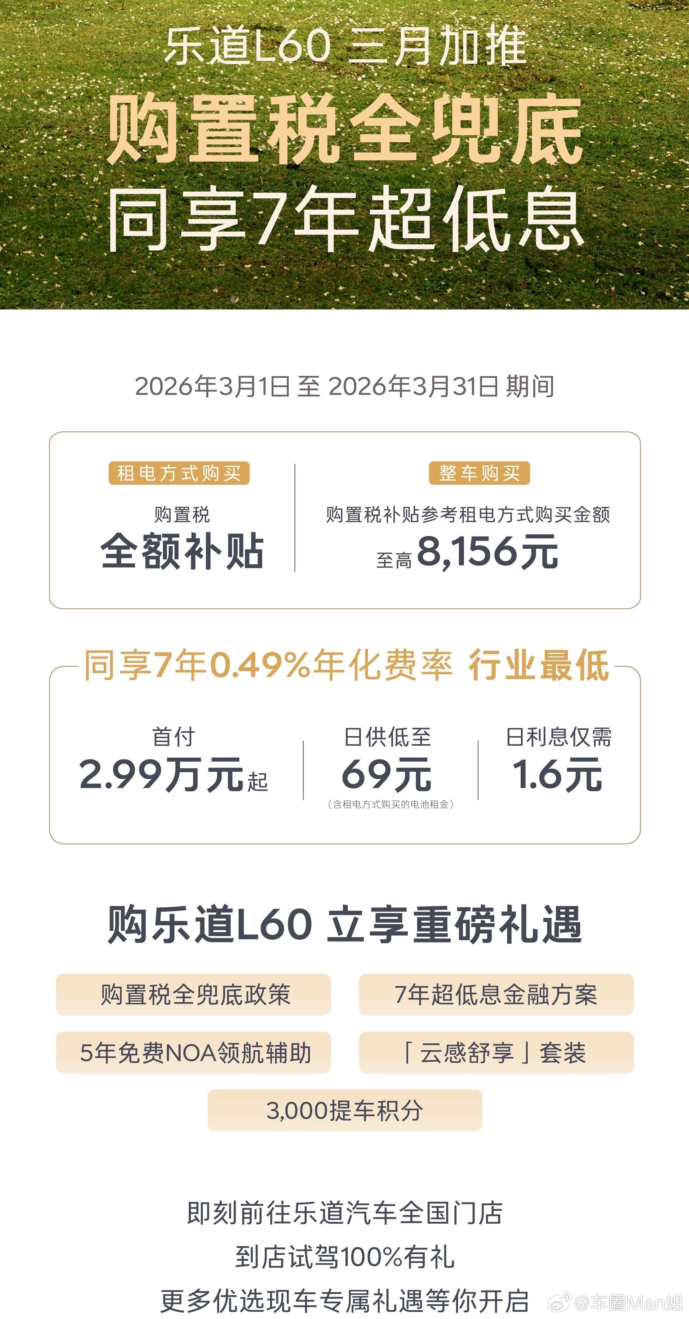 【快讯|乐道汽车3月放大招:购置税全兜底,购车成本再下探】乐道汽车3月推出重磅购车政策,在7年0.49%超低息金融方案基础上,加推购置税全兜底,租电购享全额补贴,整车购至高补贴10,262元。L60首付29,980元起、日供69元;L90首付35,960元起、日供89元,0服务费、提前还款0违约金。同时对2026年1月1日后未享补贴的L90用户追加8万积分回馈,另赠5年免费NOA、舒享套装等多重好礼,购车窗口期开启。