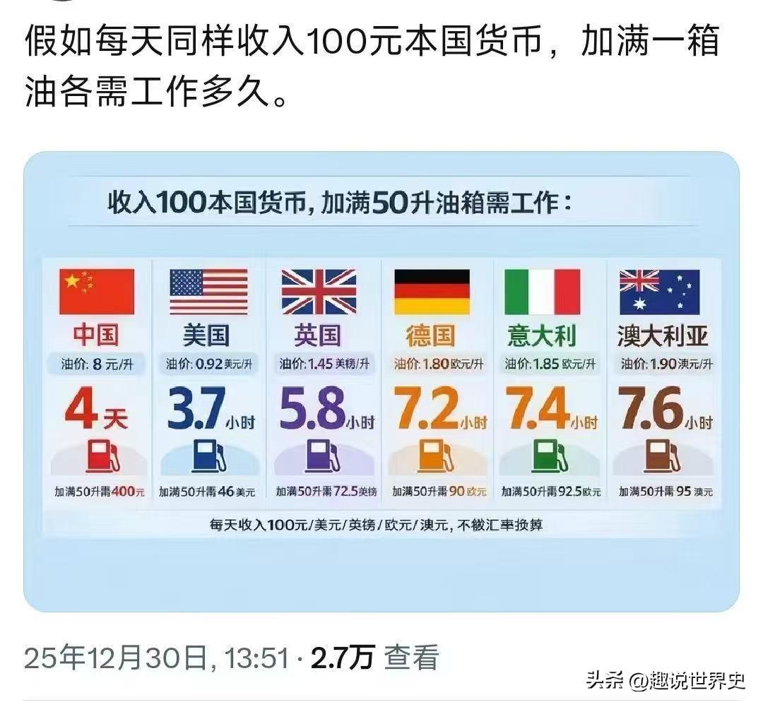 你知道吗? 假如每天同样收入100元本国货币,加满一箱油各需工作多久…普通人一天收入 国民基本收入