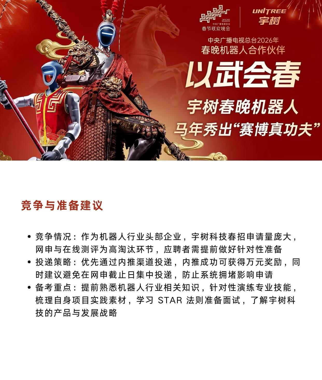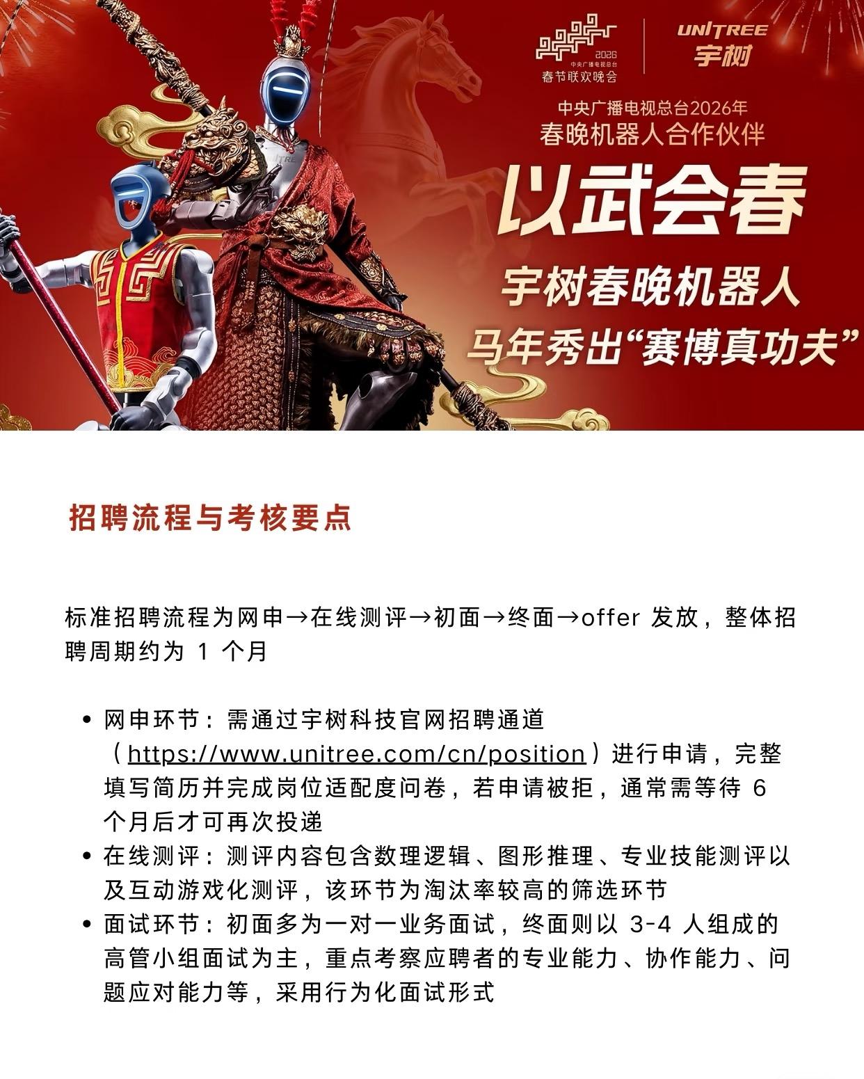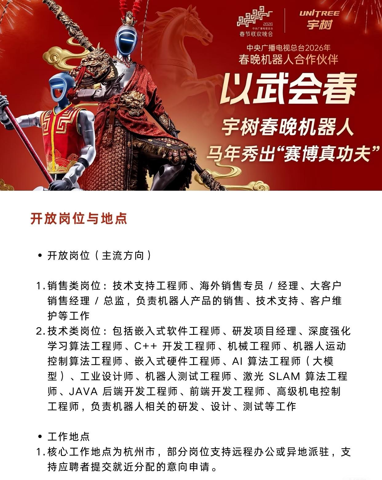 宇树科技2026春招启动啦!面向2025-2027届应届生和社会人士,本科以上学历,部分岗位大专也行哦。销售类、技术类等核心岗位等你来,工作地主要在杭州,还有远程岗。网申到4月截止,3-4月面试发offer,5月补录。官网即可报名,内推最高有万元奖励,赶紧准备起来吧!