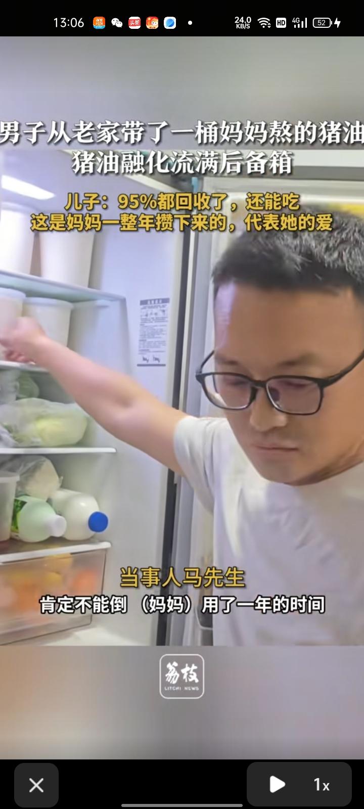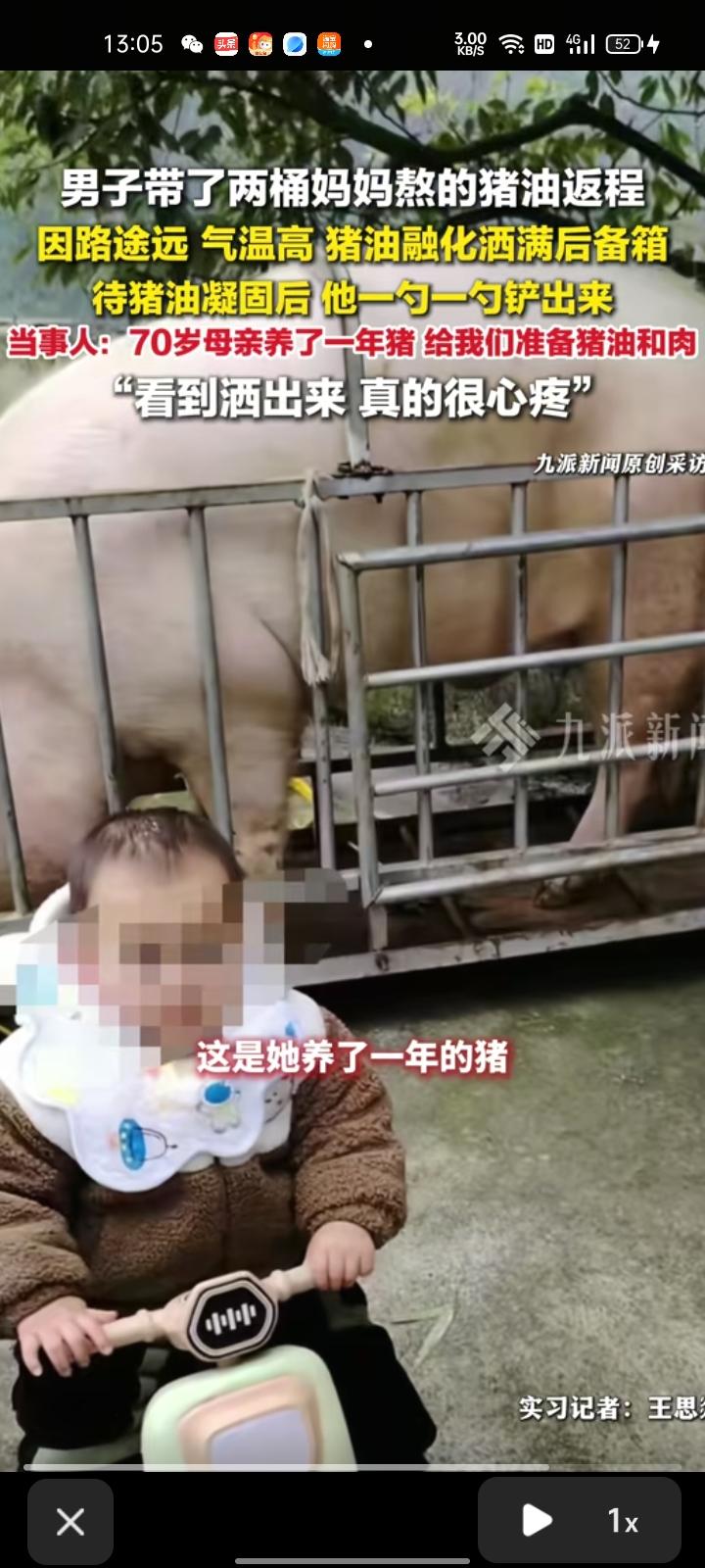 2月27日,广东东莞。马先生开车回东莞上班,带上两桶妈妈熬的猪油和20多斤鲜肉,因路途远,气温高,猪油融化后洒满后备箱,猪油凝固后就一勺一勺铲出来,坏掉的肉只能扔掉。 马先生称,母亲今年七十多岁,养了一年猪,是给孩子们准备的。95%的猪油都回收了,还能吃,这是妈妈一整年攒下来的,代表她的爱。