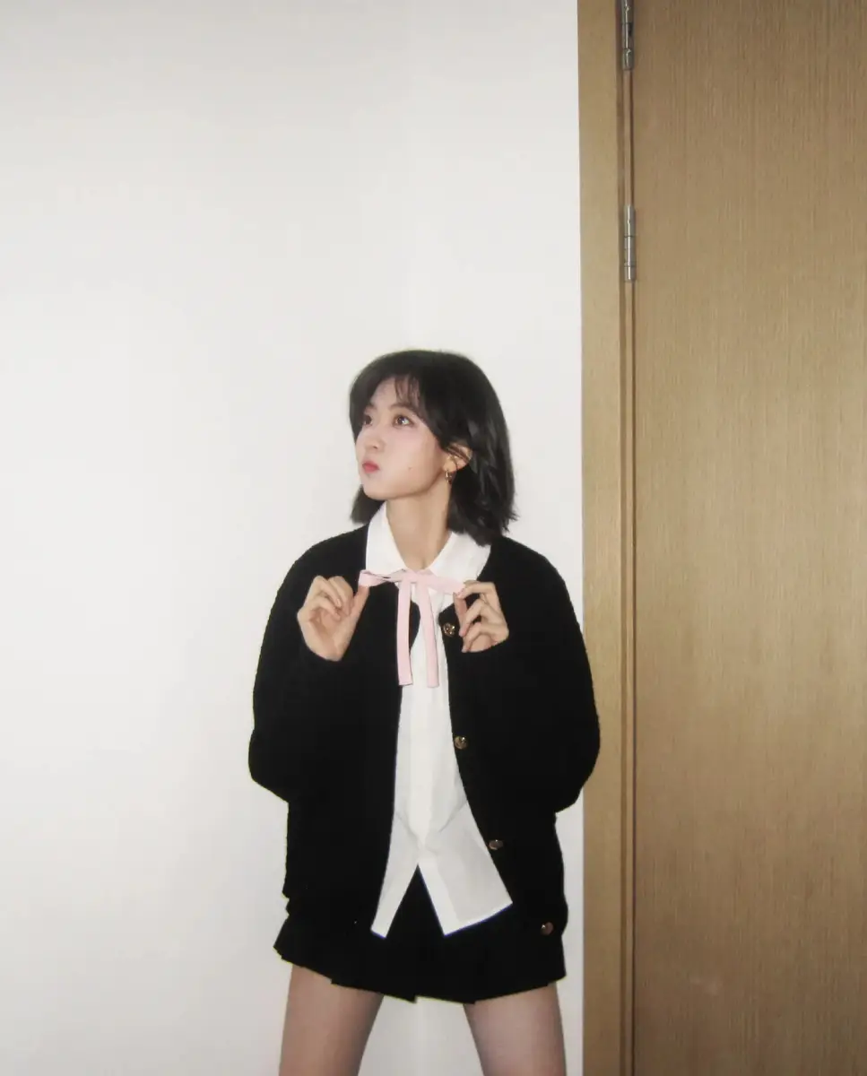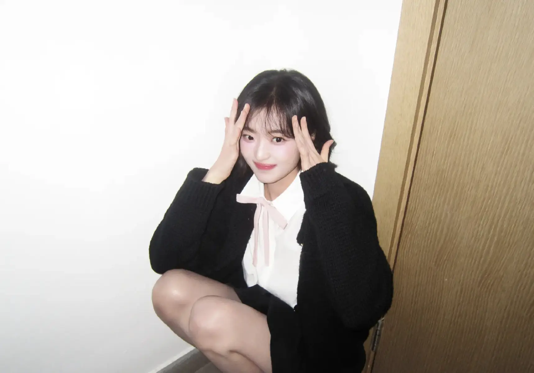 孙千身着黑色针织开衫笑容甜美 闭眼甜笑俏皮元气