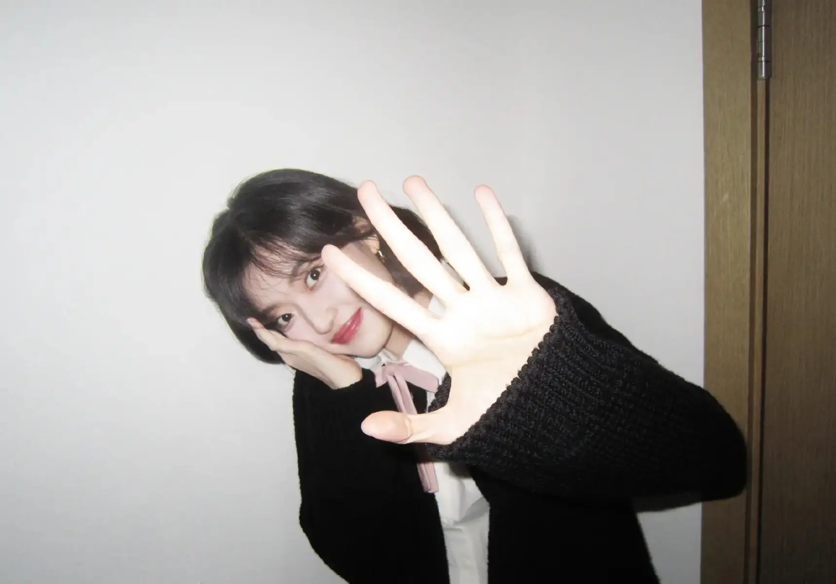 孙千身着黑色针织开衫笑容甜美闭眼甜笑俏皮元气