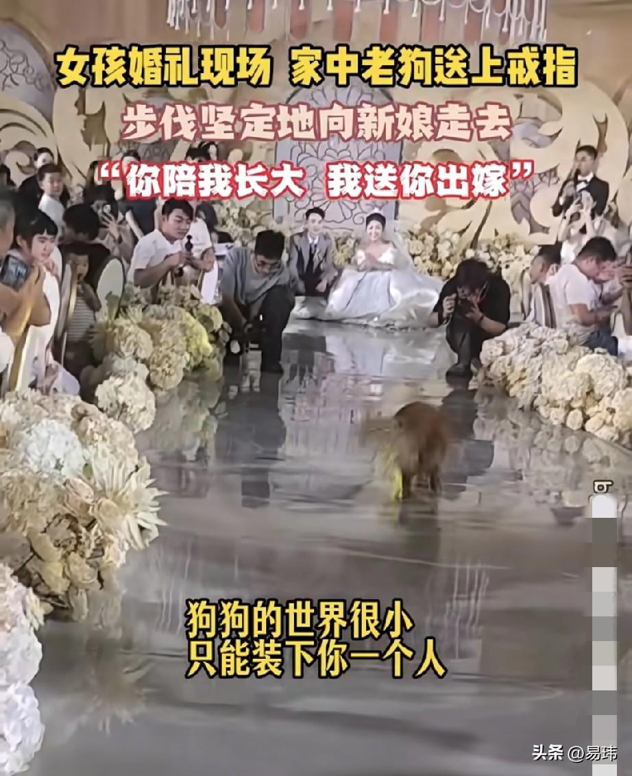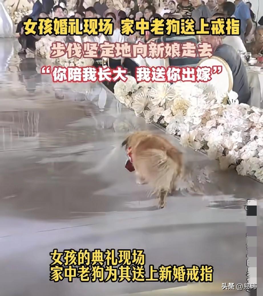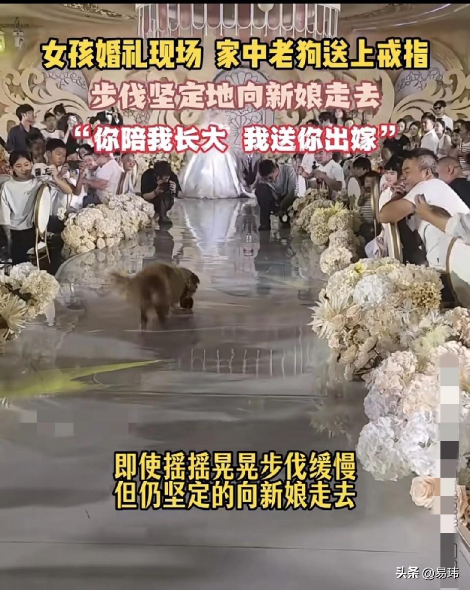 泪目了!这是一位小姐姐的婚礼现场,现场的的一幕令人潸然泪下,感动在场所有人,女孩的的典礼现场,陪伴了小姐姐整个青春的老年狗狗摇摇晃晃缓慢地朝小姐姐走去,它的步伐坚定,虽然已经年迈但它很执着。 这是它一生相随的小主人,此刻它只有一个目标,就是一定要坚持亲自为小主人送上戒指。狗狗的世界很小,小的只能装下一人!你陪我长大,我送你出嫁!最终在所有人的喝彩中,狗狗完成了小姐姐和它一生中最重要的交接仪式!也见证了他们最伟大的感情!