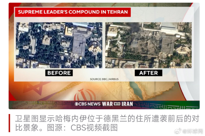 #哈梅内伊住所遭袭前后对比景象#【美媒发布卫星图,显示哈梅内伊住所遭袭的前后对比景象】#哈梅内伊遇害#美国哥伦比亚广播公司(CBS)在最新报道中发布了一组卫星图,显示已故伊朗最高领袖哈梅内伊位于该国首都德黑兰的住所在2月28日早晨遭美国和以色列袭击后,呈现出的前后对比景象。