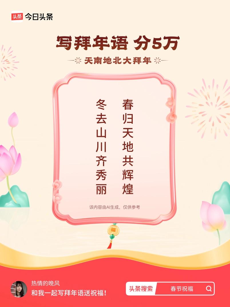 写拜年语送祝福新春拜年送祝福!我的祝福是:“冬去山川齐秀丽,春归天地共辉煌”!快来一起写祝福吧戳这里,一起领红包>