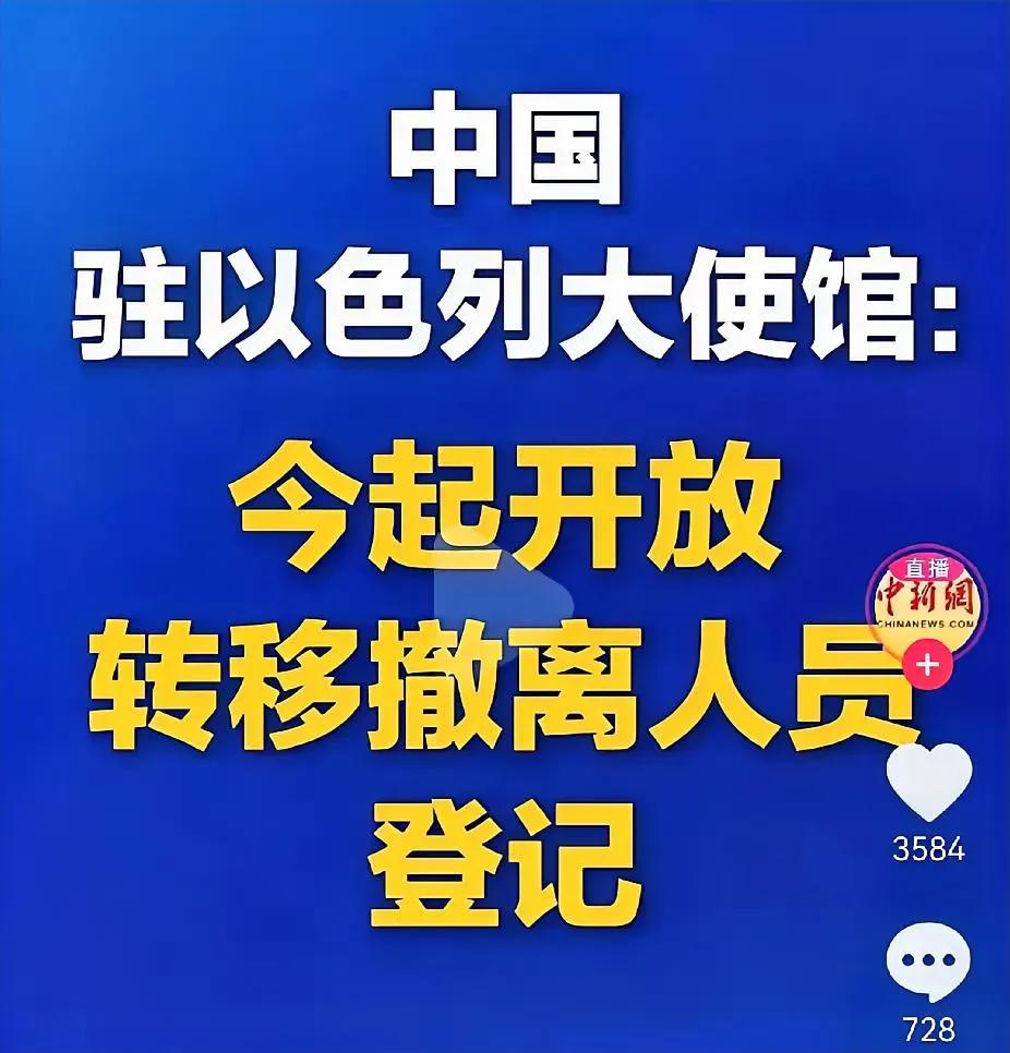 字越少,事越大!驻以使馆:撤离,不是建议回国 中国驻以色列使馆紧急通知: 开放在以公民撤离登记,用词是撤离,不是提醒、不是建议回国。 形势已到临界点:战火蔓延、机场停摆、地标遇袭,全面大战一触即发。 祖国从不含糊:护侨撤侨,永远把同胞安全放第一。 中东无旁观者,霸权靠不住。 听使馆的,立刻登记、尽快撤离!