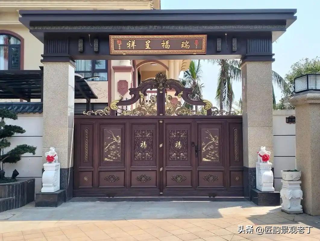 别墅大门该如何选择? 别墅的大门对于一个庭院来讲是非常重要的,一定要根据我们周围的环境和整体别墅的风格来做搭配,统一风格的大门会更加的出彩。 如果只是增加一个大门的话会显的非常的单调,老丁建议你们搭配一个门楼来使用,这样的话更加的有气势。 别墅大门也要根据我们庭院的面积来确定大小,庭院面积越大,选择的门楼相应的增大,不要搞得一个面积特别小的庭院选择一个特别大的大门,这样比例会严重的失调。 别墅大门材料的选择也很重要,尽量不要用木头的,因为是放在室外,时间久了肯定会开裂、变形、腐烂,建议你们选择铝合金的别墅大门,开句玩笑讲,人走大门还在。