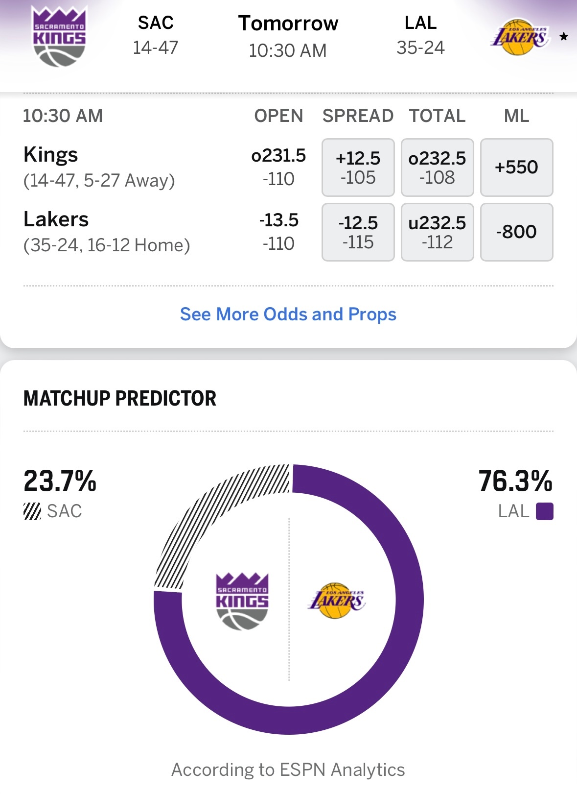优势明显?湖人明日背靠背主场10点30分对阵国王,ESPN给出获胜概率:国王23.7%,湖人76.3%。 当前指数,湖人主场-12.5。国王vs湖人