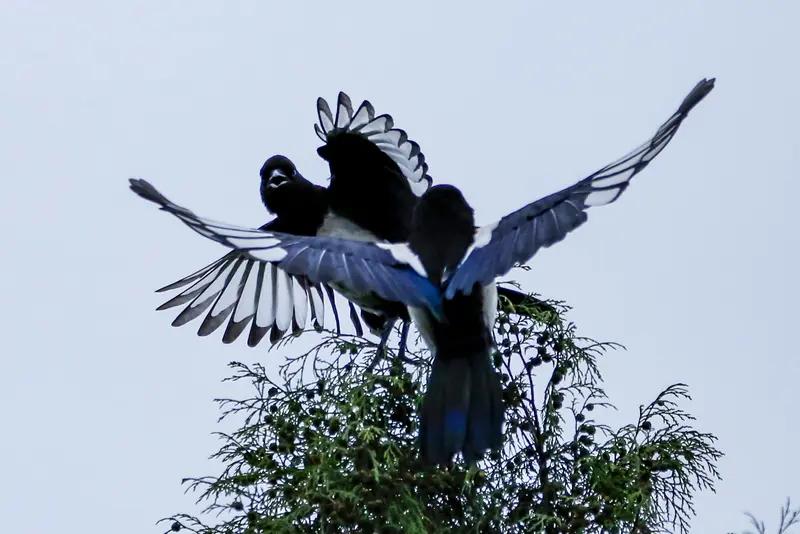 上联:琼枝傲雪,双鹊登梅呈瑞气; 下联:玉树临风,群马踏福报祥光。