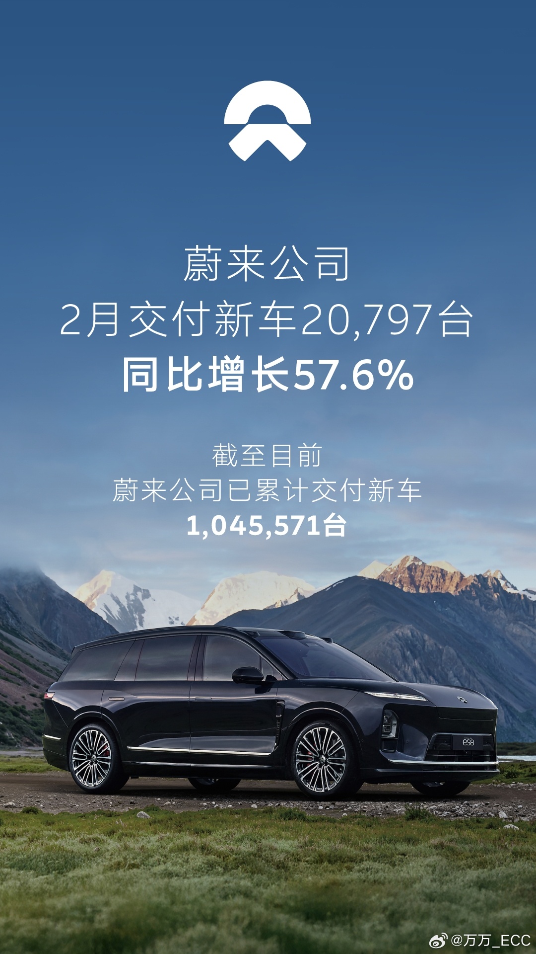 2026年2月,蔚来公司交付新车20,797台,同比增长57.6%。全新ES8历时160天,完成第70,000台新车交付。