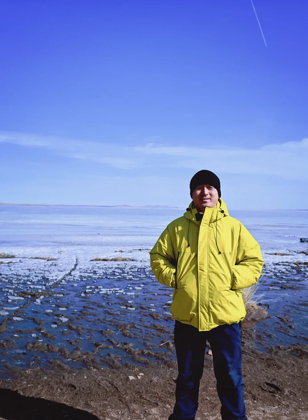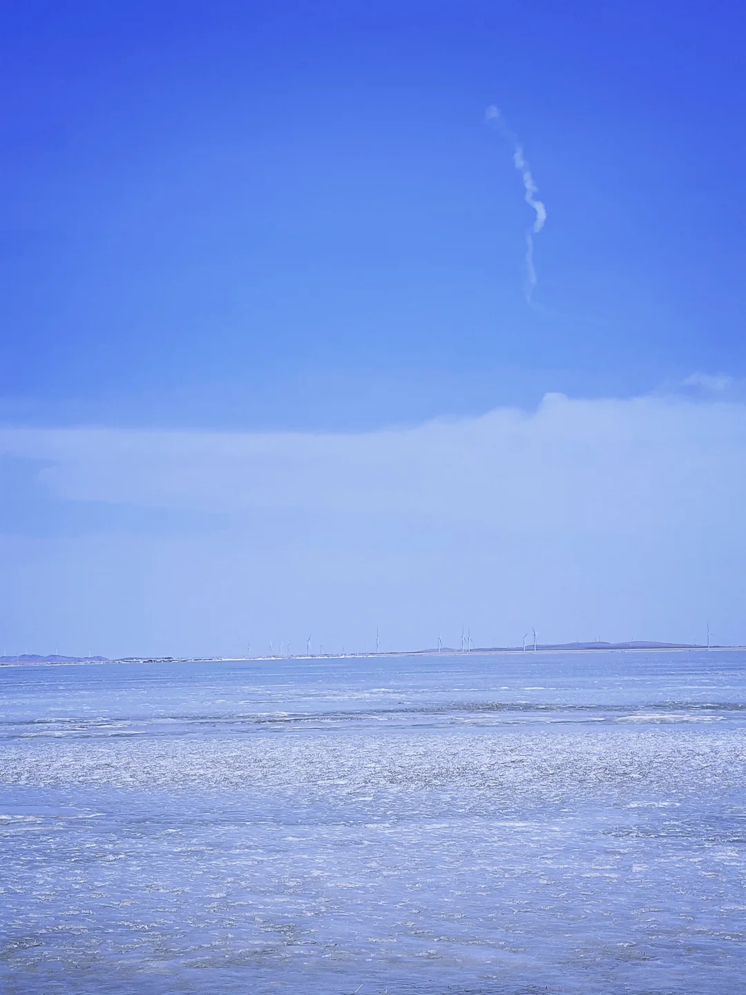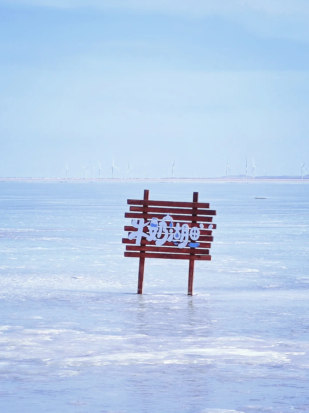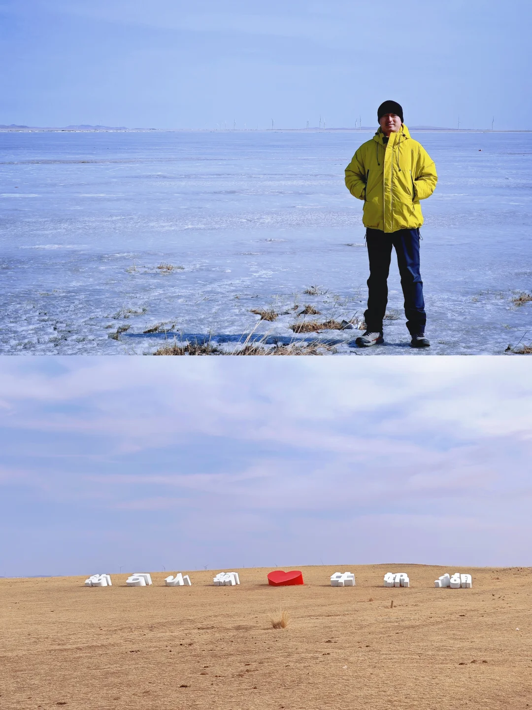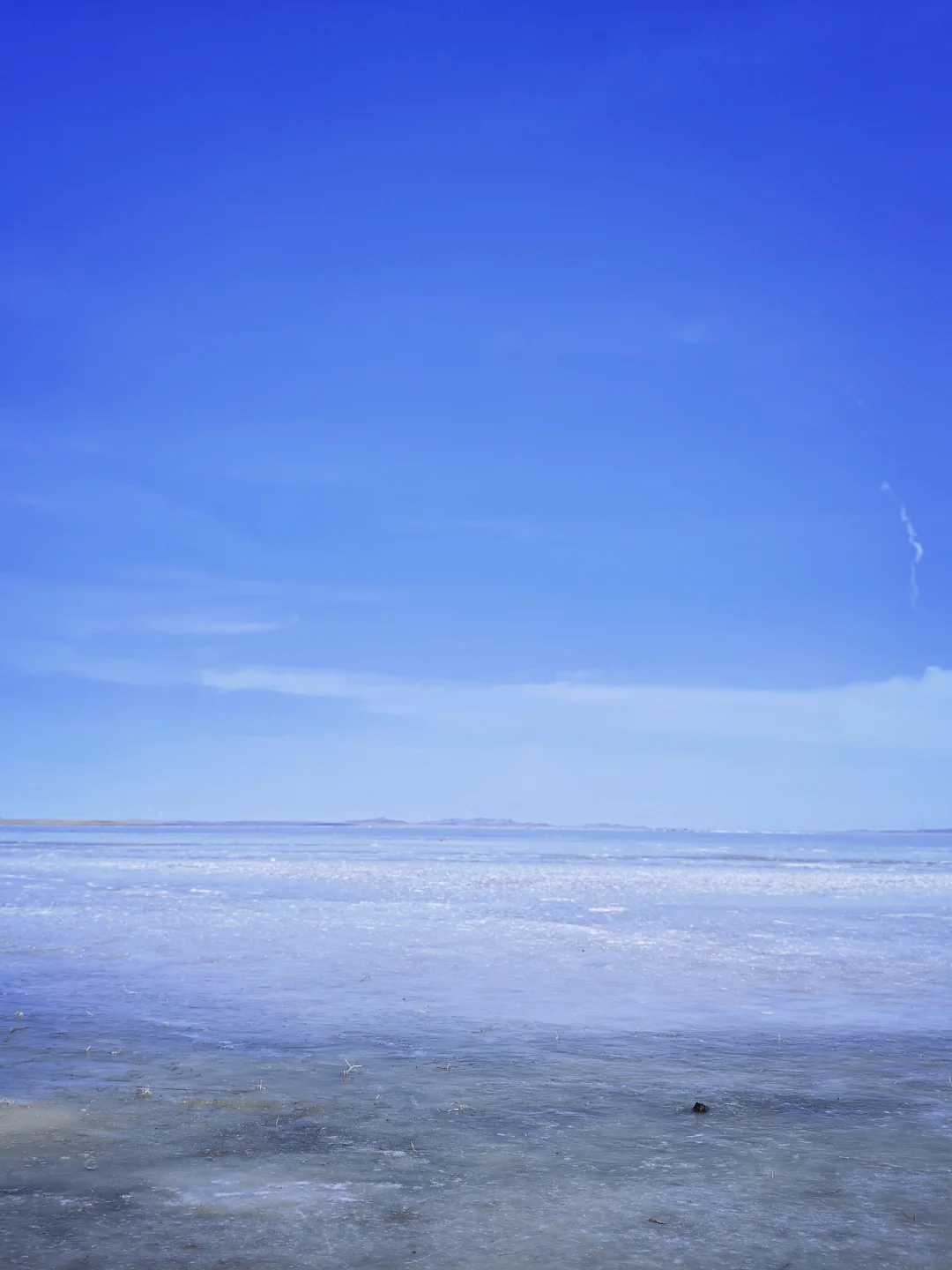 🙋♂️站在湖北岸的沙丘上往远处看,整个湖面像一块巨大的、绿白相间的玉石,安静地躺在枯黄的草原里;冰面上有裂纹,有气泡,有风吹过的痕迹。