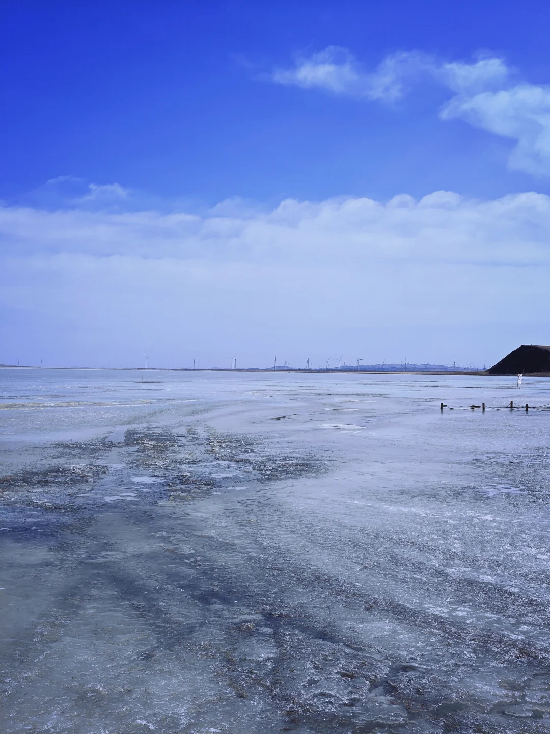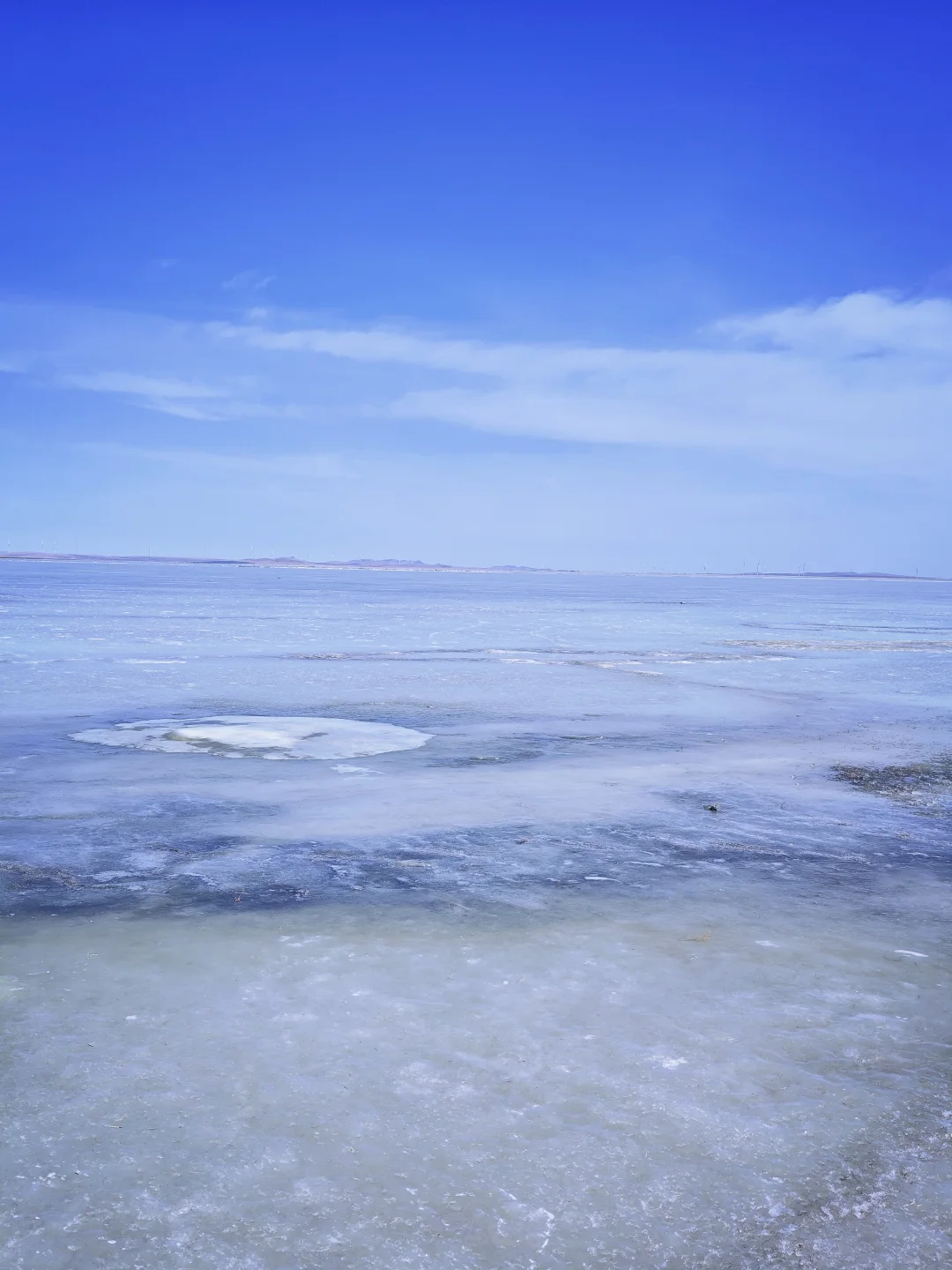 ❄冬天的它(12-2月),则换了另一副面孔;气温降到零下,湖面封冻,冰层覆盖了曾经的乳白;由于冰层厚度、盐度分布和内部气泡的差异,冰面呈现出半透明的青绿色调,被纵横交错的冰裂缝切割成一块块几何图案——有人叫它“翡翠棋盘”。