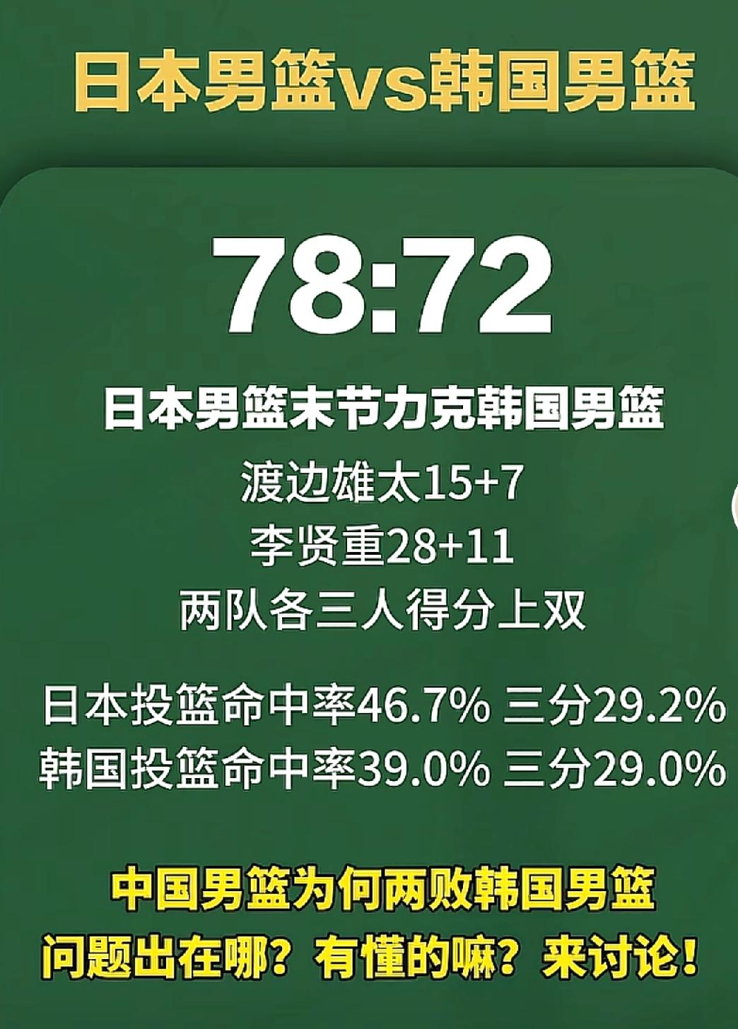 刚刚看到,日本男篮78-72击败了韩国男篮,网友提出了问题:中国男篮为何会两败韩国?来看看球迷的观点: 1、选人不对,重用了周琦,胡明轩,张镇麟,如果现在的阵容打韩国肯定不会被双杀。 2、当时刚打完全运会,而且联赛还没开始。队员身体状态和竞技状态都是最佳。 3、想赢球,别用张镇麟,周琦,王哲林,曾凡博,他们是来为了耍帅的为了挣钱。多用胡金秋,廖三宁,贺希宁,赵睿,这些才是热爱篮球的。 各位怎么看?