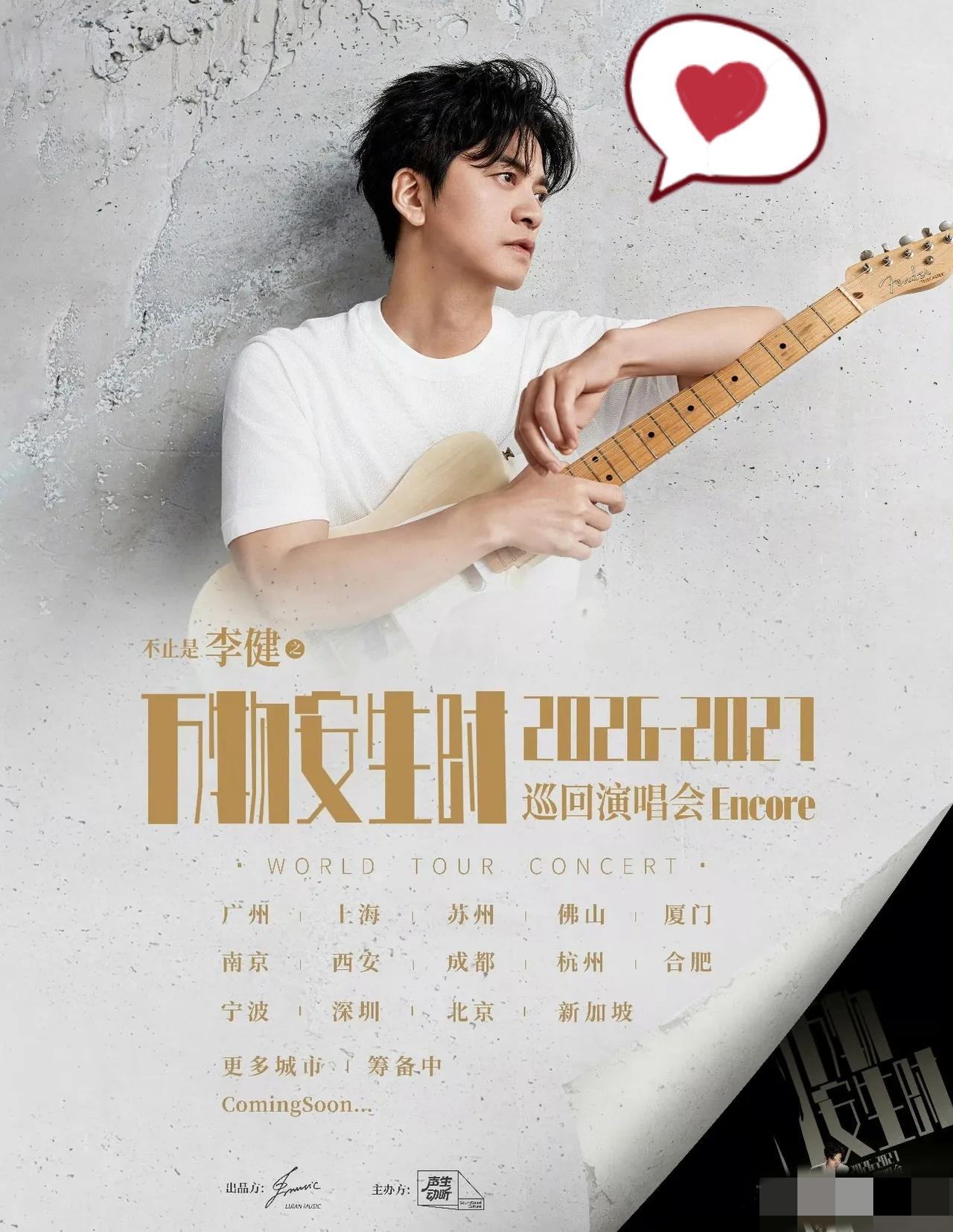 李健正式官宣!音乐诗人带着万物安生时巡演安可场重磅回归,歌迷直接狂喜。 3月1日官宣消息一出,瞬间刷屏。这次巡演横跨2026至2027年,一口气定档14城,从广州启航,走过上海、苏州、成都、西安等热门城市,还登陆新加坡,最终在北京收官。上海更是罕见连开两场,人气爆棚。 舞台全面升级,四面台搭配全息投影与环幕,把东方美学做到极致,经典曲目全新编曲,视听体验拉满。不炒作、不喧哗,李健用最干净的歌声,治愈一整年的疲惫。 这不仅是一场演唱会,更是与歌迷的诗意重逢。你最想去哪一站现场听歌?