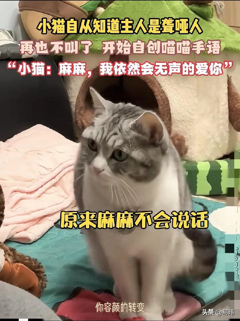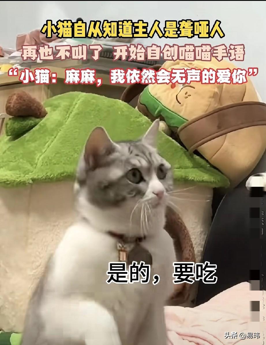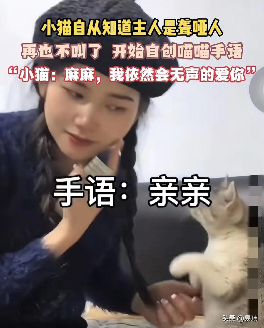 泪目了!一位聋哑小姐姐养了一只宠物猫,自从小猫发现小姐姐不会说话后,就再也不叫了,还自创了喵喵手语,而且它也聪明的看懂了小姐姐的手势。 小姐姐的手势它很多都能看懂,小姐姐用手语叫它站立,吃饭,亲亲。它都很快的做出回应,真的是太聪明了,虽然主人不会说话,可小猫从不嫌弃,还是依然无声的爱着小姐姐。 小姐姐也很幸运很开心,有这么一只聪明伶俐的小猫陪着她。相信他们一定会越过越好的。