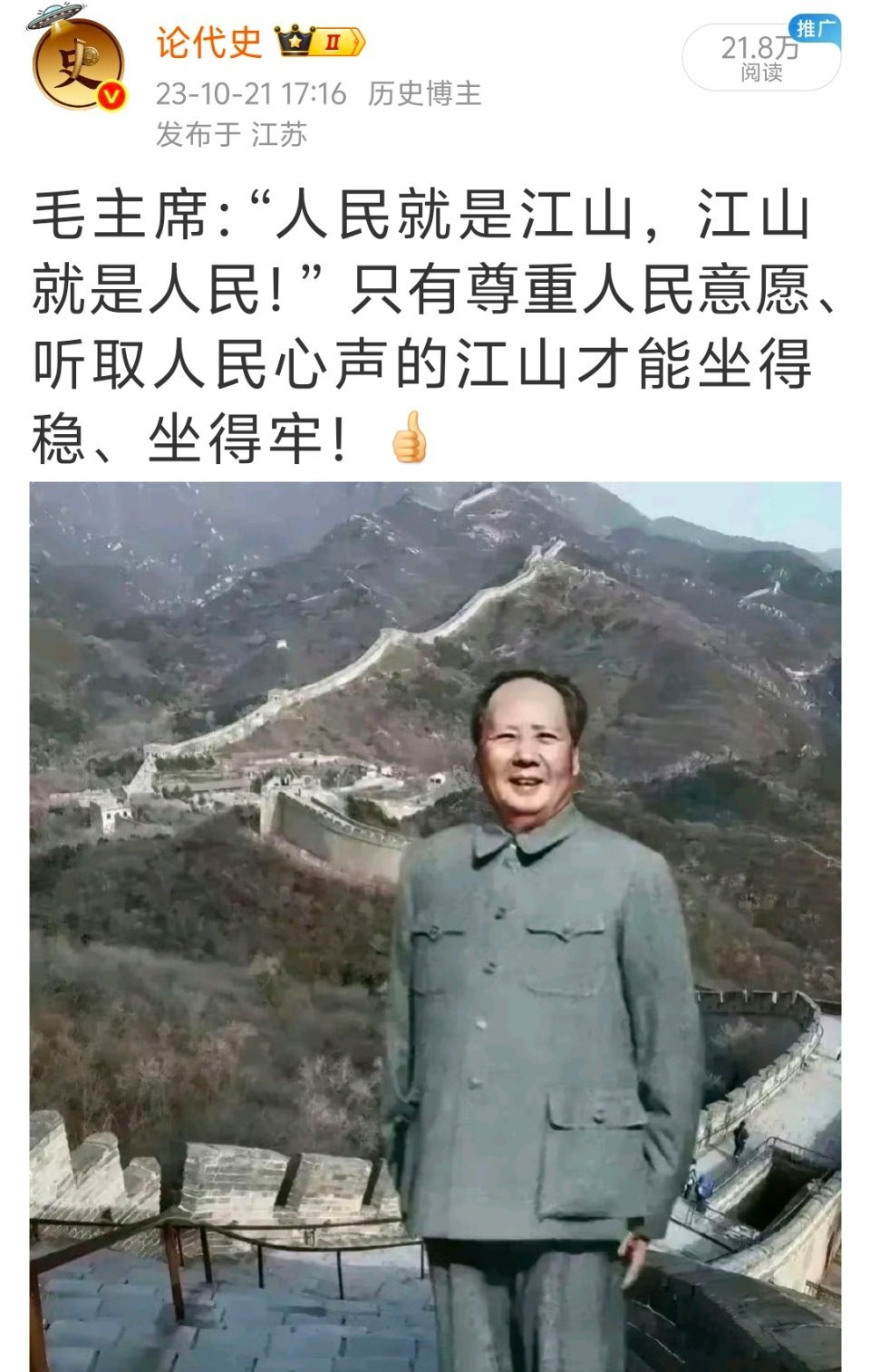 毛爷爷曾说过: “人民群众是依靠对象”,也就是说要相信人民群众,依靠人民群众。他还说: “人民,只有人民,才是创造世界历史的动力!”也就是说,没有人民就不可能创造历史,人民群众才是真正的英雄!