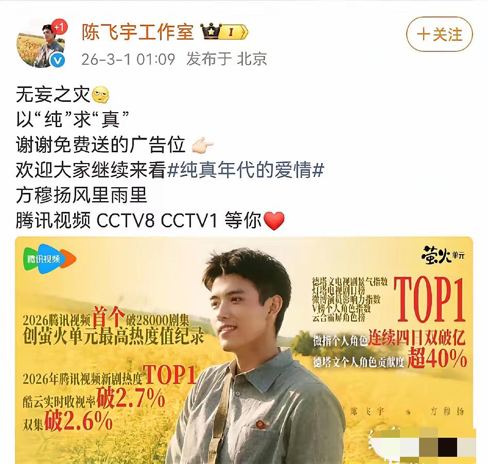 陈凯歌儿子,凌晨高调发文! ​3月1日凌晨01:09,星二代陈飞宇,突然在社交平台高调发文,字里行间很激动,却又透露着一股幽默感,这到底是怎么回事呢? ​原来是前一天,有瓜主爆料了陈飞宇的感情绯闻,此举陈飞宇是为了辟谣。没想到,辟谣的同时陈飞宇还不忘谢谢免费送的广告位,顺便宣传了一波新剧《纯真年代的爱情》”。 ​​这波操作可太有梗了!“纯”和“真”既回应了传闻里的不实揣测,又巧妙给新作品《纯真年代的爱情》打了广告,网友们纷纷调侃“这波反向营销绝了”。 内娱的舆论场向来瞬息万变,艺人遇到绯闻传闻,大多是慌乱解释、强硬反驳,要么就是沉默冷处理,很少有人能像陈飞宇团队这样,把一场突如其来的负面风波,轻松转化成了自带热度的正向宣传。凌晨发文的时机拿捏得恰到好处,既没有让不实传闻持续发酵,又用轻松调侃的语气消解了舆论的攻击性,让吃瓜群众瞬间没了对立情绪。 这份从容背后,是团队超高的公关情商,也是陈飞宇本人心态的成熟。作为星二代,他从出道以来就一直活在大众的审视之下,被贴上各种标签,也承受着比普通艺人更多的争议。面对无妄之灾,他没有陷入情绪内耗,反而抓住核心,用作品关键词回应质疑,把所有目光都拉回到演员的本职工作上。 对比圈内很多艺人被绯闻缠身时的狼狈应对,这波操作堪称教科书级别。它没有刻意卖惨,也没有激烈对峙,用一句玩笑话化解尴尬,既守住了自身的体面,也给足了路人好感。大家原本是冲着吃瓜而来,最后却被这波机智操作圈粉,纷纷主动去关注他的新剧,实现了口碑与热度的双赢。 这也给内娱很多艺人提了个醒,面对舆论风波,强硬对抗从来不是唯一的解法。清醒、通透、专注于自身作品,才是长久立足的根本。与其纠结于流言蜚语,不如用实力和智慧化解危机,把每一次挑战,都变成证明自己的机会。 各位读者你们怎么看?欢迎在评论区讨论。 陈凯歌全家福 陈飞宇综艺