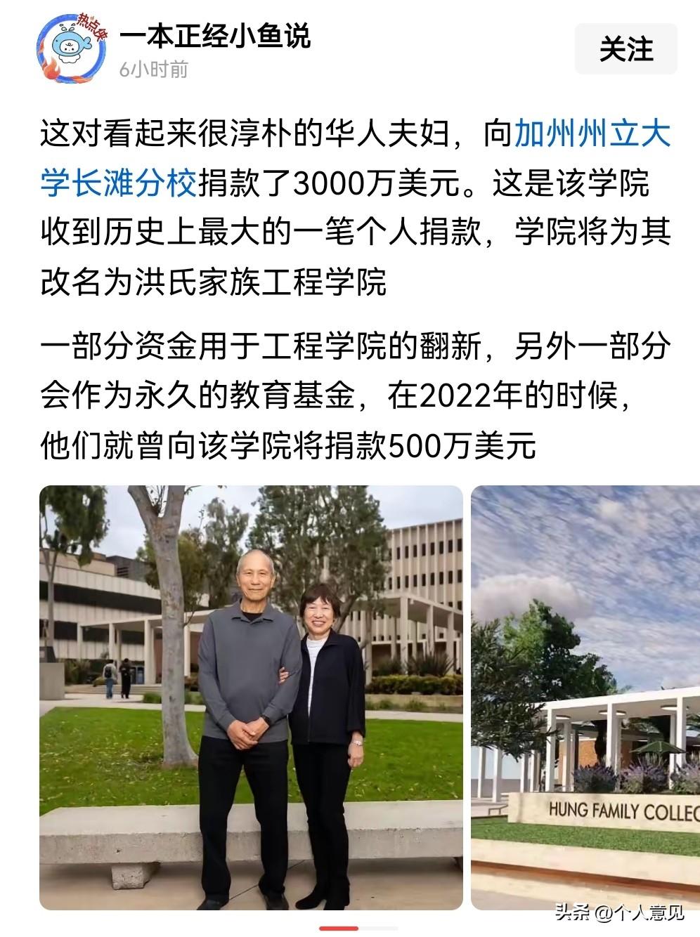 我就想不明白这事有啥值得大张旗鼓宣传的?有啥需要赞誉的? 一个所谓的洪姓夫妇给美国的大学捐款,然后他们的拥趸在中文互联网上发帖宣扬他们的“功绩”是不是有些可笑了? 中国还有很多需要帮助的学校,需要帮助的孩子,咋没见到他们的身影呢? 当然,钱是他们自己的,怎么分配是他们自己的事,别人无权干涉,但看到他们给美国大学捐款,然后在中文互联网上沽名钓誉,总有些心里不舒服,反正我个人看不惯!