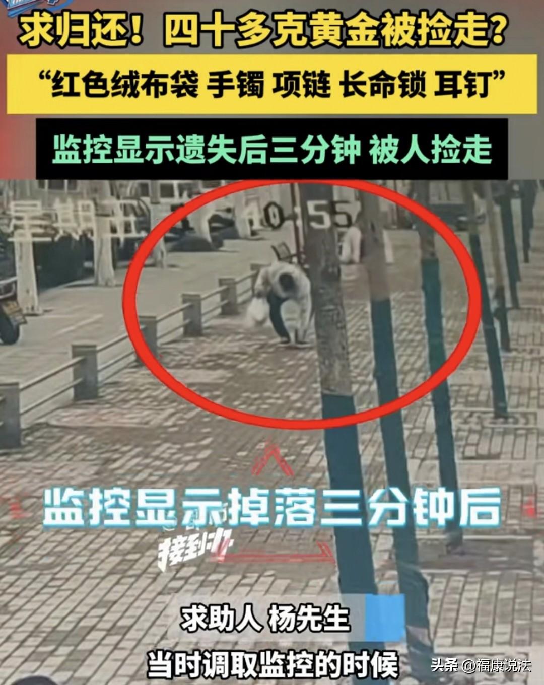 急哭了!河南许昌,男子不小心把一装着金手镯、金项链、长命锁等共40多克黄金红色绒布袋弄丢了,3分钟后,被一对母子捡走,男子发现黄金丢失后,崩溃自责,这黄金是媳妇的,父亲昏迷住院后,媳妇二话不说拿出来卖,想给父亲治病。男子在镜头面前双手合十求助:希望捡到黄金的人能主动归还,家里需要钱… 2月27号下午5点半左右,杨先生开车带着生病的住院的父亲出来吃点饭,从医院出来后,他将车在长葛义乌城那边的一处停车位上,他先下车等着父亲。 杨先生站在路上等父亲下车的时候,手从衣兜里抽出来时,一不小心把装着黄金的红色绒布袋弄掉了。 这个红色绒布袋里有一个约20克的金手镯、一根金项链,还有一个孩子戴的长命锁,这俩加起来也有20克左右,还有一个不到2克的耳钉。 然而,红色绒布袋掉在地上后,杨先生也没发现。 等他和父亲吃完饭回来,也就一二十分钟的时间,他回车上拿药,掏钥匙刚打开车门,猛然发现兜里的黄金没了。 那一刻,杨先生六神无主,这40多克黄金可是他打算买了给父亲看病的,这下丢了可怎么办啊? 杨先生顾不上后悔,立马报警。 民警到了现场,调取监控发现,从杨先生掉下红色绒布袋的三分钟后,一对母子经过,一男子看到地上的红布袋,弯腰捡起,拿着翻来覆去看了看,四处看看没人,就收了起来,俩人直接走了。 那母子俩走到马路对面,上了车后,坐在车里好久也没走,但可惜的是监控拍不到车牌号。 杨先生考虑到这母子俩在车上很久没出来,也没有在路边等,他猜测对方可能不想还。 杨先生非常崩溃自责,为什么自己没有收好,为什么那么不小心,把这40多克黄金弄丢了。 当初,父亲是因为昏迷住院的,他和妻子心急如焚,想凑钱给父亲治病,妻子人好,二话不说把结婚时买的黄金饰品都拿了出来,想着卖掉换钱。 本来杨先生想拿着黄金去问一下价格,没成想自己给弄丢了。 自从黄金丢了,杨先生的妻子一句也没有责备他,反而陪着他一起找记者帮忙。 据杨先生妻子说,现在事情的进展就是,警方还在人脸识别中。 40克黄金丢失,如果找到话也需要一定的时间,可是,杨先生着急啊! 他找了记者,双手合十在镜头面前对捡到黄金的人说:求求你们,能看到视频,能尽量还给我。因为这对我来说非常重要,家里需要这份钱。 这件事让人揪心,杨先生也急的快哭了,就怕找不回来这40克黄金。 不过,从法律方面来说,如果这对母子捡到黄金是有返还义务的。 《民法典》第314条规定:拾得遗失物,应当返还权利人。拾得人应当及时通知权利人领取,或者送交公安等有关部门。 也就是说,捡到东西不还,不仅是道德问题,更是违法行为。 因为,杨先生丢失的是40多克黄金,价值不低。 这对母子捡到后应该联系失主归还,或者交给相关部门。 假如,这对母子拒绝归还黄金,自己留下,因40克黄金属于数额较大,且母子拒不归还,则可能涉嫌“侵占罪”。 监控已经拍下了捡拾过程,这在法律上就是铁证,拿了别人的救命钱,这“便宜”真的一点都不好占。 谁家都有遇到难处的时候。杨先生丢的这40克金子,不仅是他妻子的心意,更是老父亲在病房里的医药费。 妻子通情达理没责怪,那是她大度,心疼丈夫。但杨先生心里的愧疚和焦急,隔着屏幕都能感受到。 杨先生说那对母子捡到布袋后在车里坐了很久,不知道他们是不是想归还,或许那一刻他们动了贪念。 但杨先生一个大男人对着镜头双手合十、几乎哀求地寻找这对母子,看着让人心酸。 做人把良心摆正,这种意外之财往往是别人的“救命钱”。捡到了如果不还,这就是在别人伤口上撒盐。 如果能主动还回去,不仅救了一个家庭的急,也给身边的孩子做了一个最好的榜样。希望这对母子能看到杨先生的求助,尽早归还。 对此,你咋看呢?