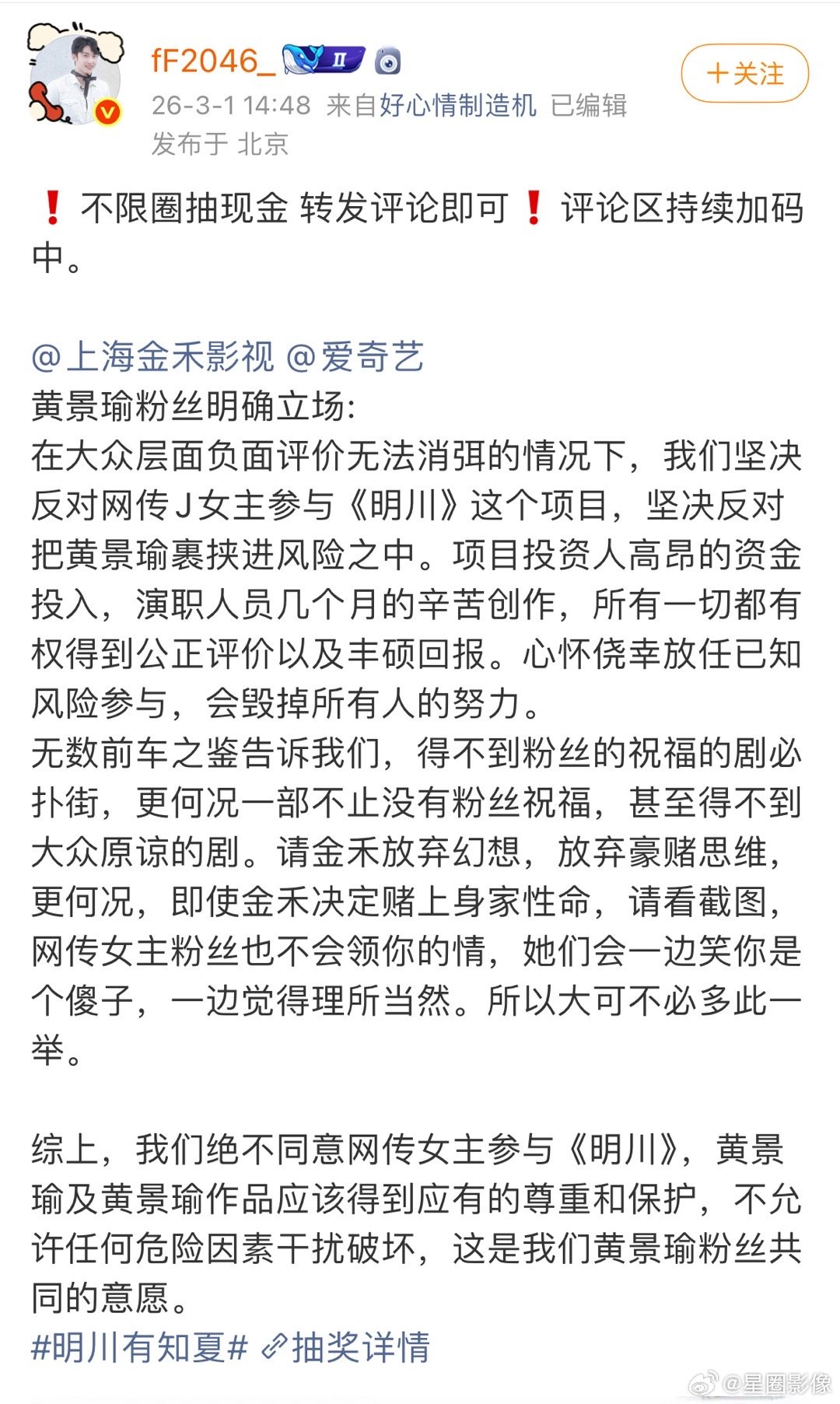 全内娱都在维权。。。金晨肇事逃逸的事还没过多久。马上要进组黄景瑜的《明川有知夏》了。对黄景瑜粉丝来说,这担忧没毛病