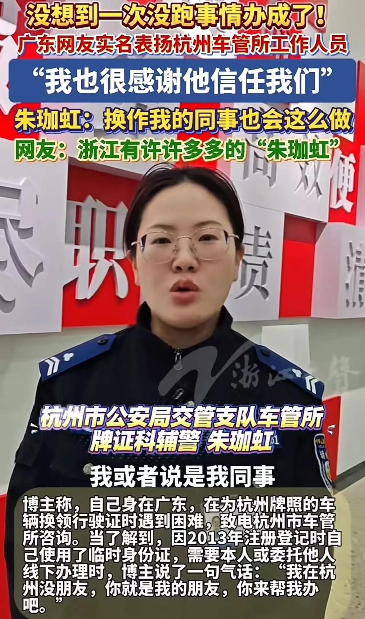 浙江又火了!男子在广东行驶证需要换证,被杭州车管所的工作人员要求本人或者朋友代办!男子觉得被刁难,一气之下对工作人员说“我在杭州没朋友,要不你帮我办”,工作人员的做法让他惊呆了! 这位男子姓谢,十几年前在杭州买车上了浙A牌照,后来因工作定居广东。这次行驶证副页年检章盖满要换证,本想在交管12123上线上办理,结果系统提示信息不符——当年他用临时身份证办的车辆登记,后续换正式身份证没去更新,线上路直接走不通。 打电话给杭州车管所咨询,工作人员耐心解释,这种信息不一致的特殊情况,按规定确实需要本人到场,或者委托杭州的朋友带齐材料代办。谢先生当时火气就上来了,广东到杭州两千多公里,跑一趟费时费钱;在杭州又没亲戚朋友,找谁代办都是难题。满心委屈和烦躁之下,才脱口而出那句带着赌气的话。 他本以为电话那头会是冷冰冰的拒绝,毕竟按规定办事,工作人员完全有理由不理会他的气话。没想到沉默几秒后,工作人员温柔又坚定地回应:“如果你信任我,我可以帮你办。” 这话直接让谢先生愣住了,不敢相信自己的耳朵。犹豫过后,他还是选择相信这位素未谋面的工作人员,把身份证、车辆登记证等重要材料寄往杭州。收到材料后,工作人员全程上心,核对信息、调档案、办手续,一步步帮他把新行驶证办好,还直接寄回了广东。 拿到崭新的行驶证时,谢先生心里又暖又愧疚,当初的气话,竟换来了这样贴心的帮助。 其实这事最打动人的,不是工作人员帮了多大的忙,而是打破了大家对窗口单位的刻板印象。很多时候,我们遇到办事难题,听到的都是“按规定来”“没办法”,规则成了推诿的借口,却忘了规则的初衷是为了服务群众。 杭州车管所的这位工作人员,守好了规则的底线,又用灵活的方式解决了群众的实际困难。她没有因为规定而冷漠,也没有因为帮忙而违规,这份人情味,才是服务的真谛。 反观我们身边,不少服务窗口还停留在“照本宣科”的阶段,面对群众的特殊情况,只会机械照搬规定,不愿多走一步、多想一点。殊不知,群众的不满,往往不是因为事情办不成,而是因为办事过程中的冷漠和敷衍。 规则是死的,但人是活的。真正的为民服务,从来都不是把规定挂在墙上,而是记在心里,在坚守原则的同时,多一份共情,多一份担当。就像杭州这位工作人员,用一次暖心的代办,让千里之外的群众感受到了一座城市的温度。 一件小事,也能照见服务的初心。比起口号喊得响亮,这种实实在在为群众解决问题的举动,更能打动人心。 各位读者你们怎么看?欢迎在评论区讨论。