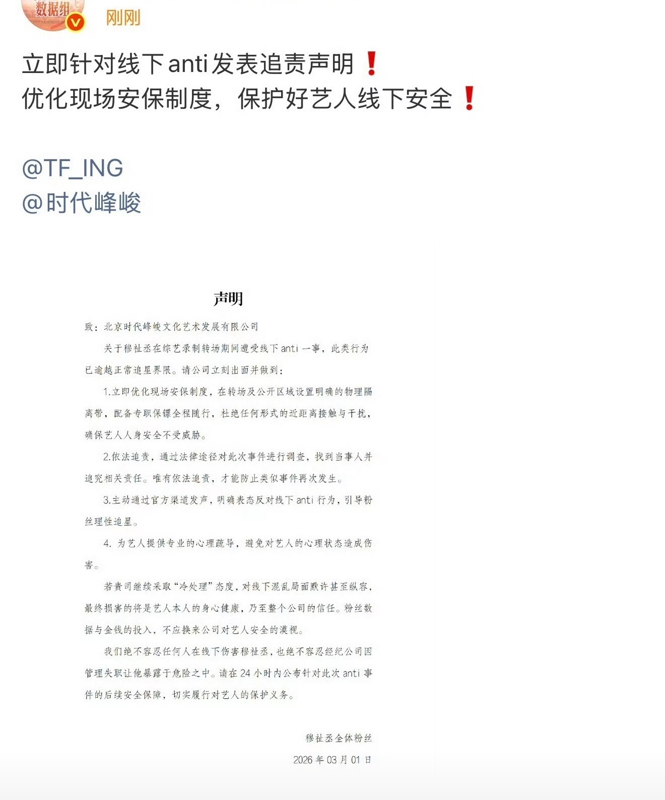 穆祉丞粉丝发文了要求对线下anti的行为发表追责声明,保护好艺人线下安全!谁anti他了?