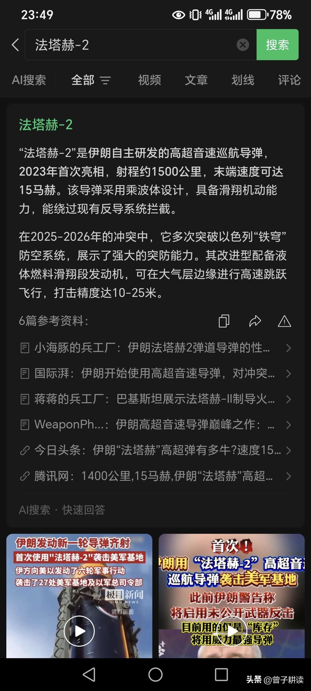 期待伊朗后续还有更新的武器,扩大战果,比如说在海边沙滩捡到的那种,或者是兄弟武装部队在沙漠中捡到送给他的。[奋斗][笑哭] “法塔赫-2”是伊朗自主研发的高超音速巡航导弹,2023年首次亮相,射程约1500公里,末端速度可达15马赫。