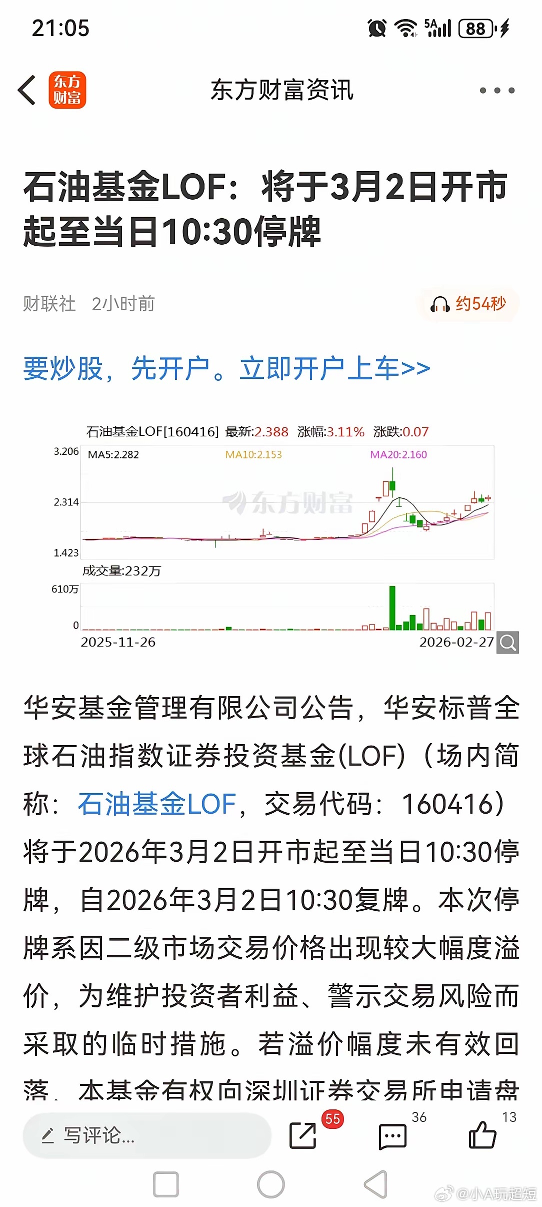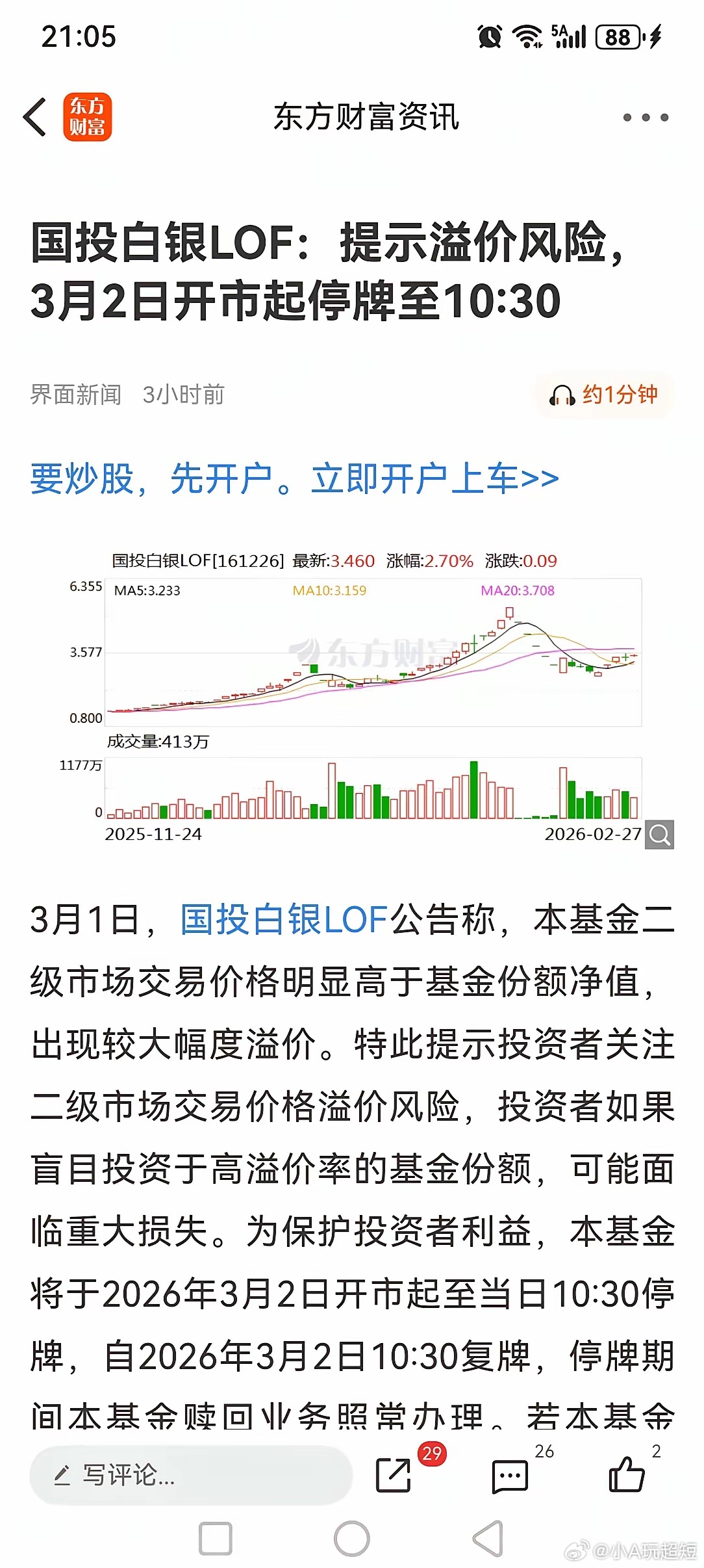 晚间市场传来三大重要消息,或影响A股明天相关走势。消息一,据相关基金公告称,白银、石油LOF因高溢价3月2日起停牌警示。这有助于防止商品盲目炒作,有助于保障投资者利益。消息二,据悉,从3月2日起,远期售汇风险准备金率从20%降至0。这有助于降低企业换汇成本,有助于稳定汇率。消息三,据报道,巴方称巴阿冲突中阿方已有415人死亡。各地区冲突不断,或将影响市场风险偏好,黄金等避险板块或将受益。对此你们怎么看?