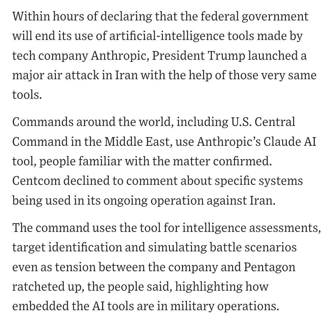 《华尔街日报》:在宣布联邦政府将停止使用由科技公司 Anthropic 开发的人工智能工具后仅几小时,特朗普总统便在这些工具的协助下,对伊朗发动了一场大规模空中袭击。