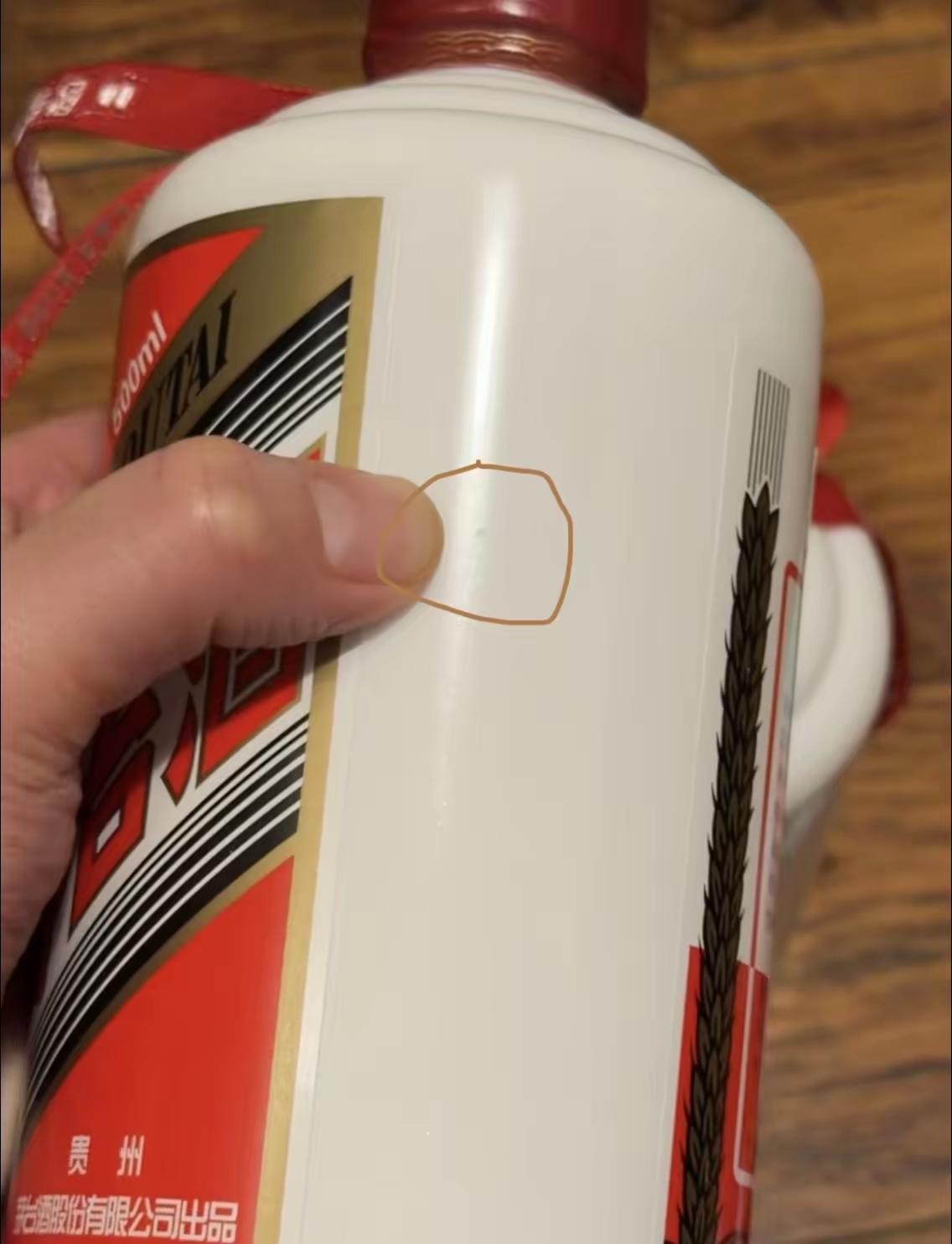 有网友说,自己买的茅台好像不对,瓶子上好似有针孔。 说真的,如果这瓶是假的,也不会假的那么明显吧? 个人觉得,这应该是瓶子本身的瑕疵,打孔造假不会在这么明显位置的,一般都是在贴纸后面。 大家说是不是?茅台价格乱象 网购假茅台 茅台防伪标识 高仿茅台鉴别 茅台酒瓶变形