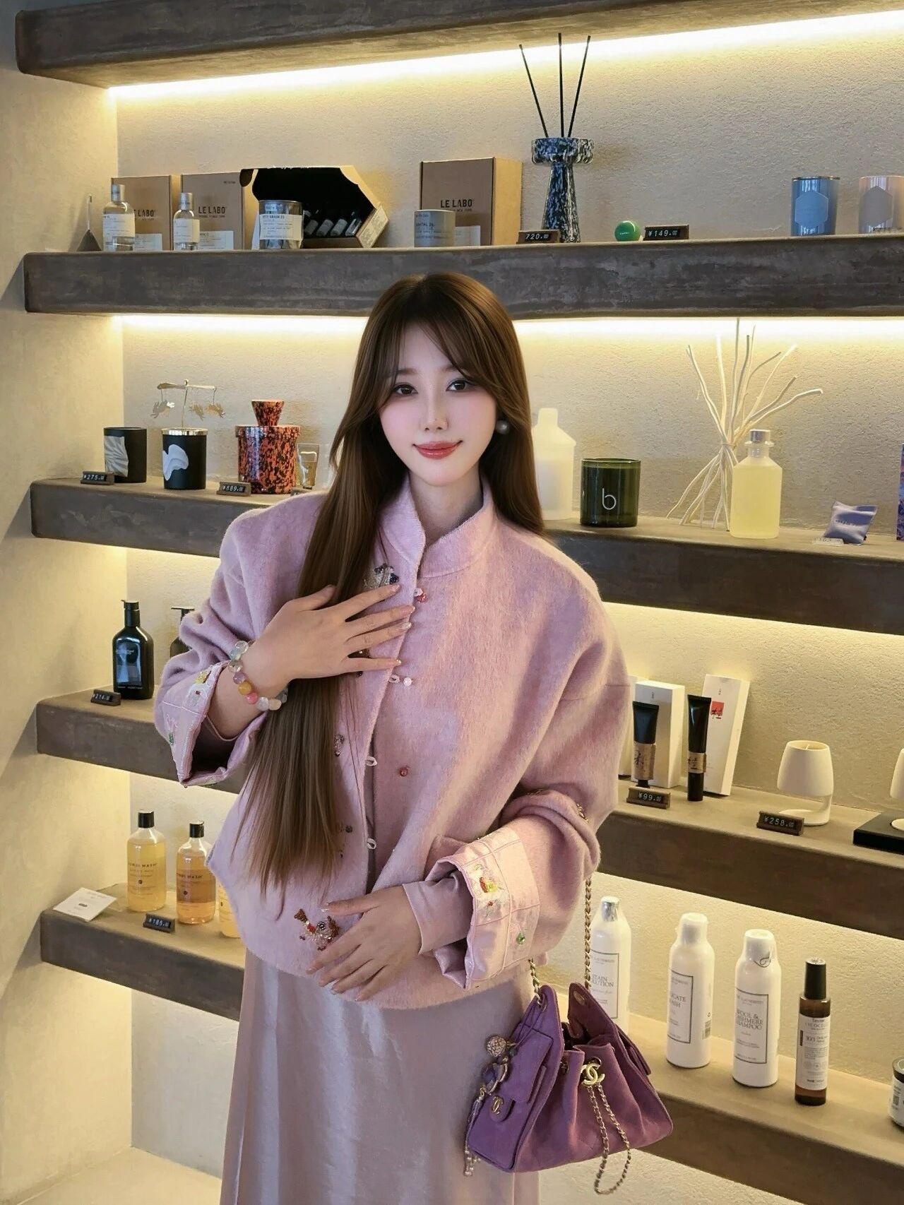 温柔香芋紫套装太显气质啦💜 宽松毛呢外套搭配同色系缎面连衣裙,配色温柔高级,搭配紫色链条包与铆钉高跟鞋,温婉又精致。长发披肩、妆容清透,慵懒坐姿尽显优雅,氛围感与贵气感直接拉满,温柔又迷人~