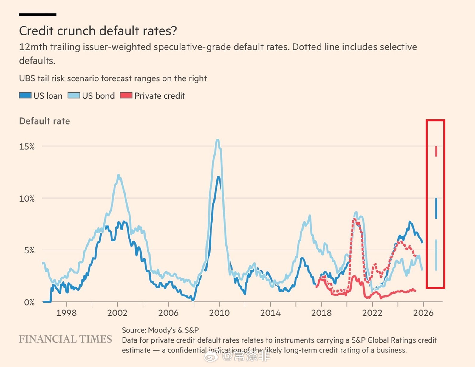 在人工智能快速颠覆的最坏情况下, 瑞银预测美国私人信贷违约率可能飙升至 14-15%,与全球金融危机期间美国债券市场的违约峰值水平相当。