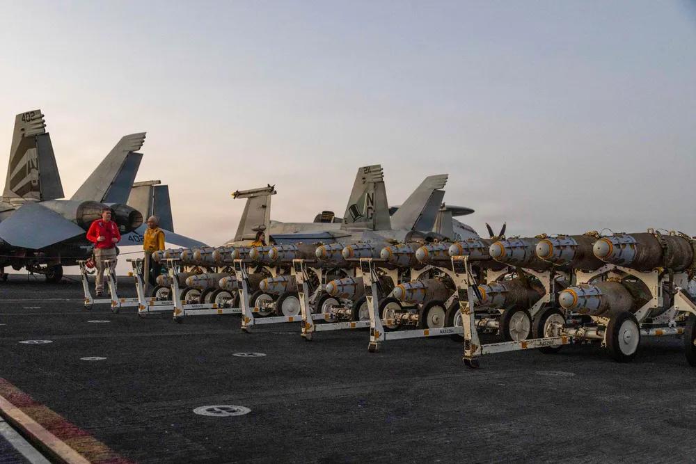 2026年2月27日,美国水兵在阿拉伯海尼米兹级航空母舰亚伯拉罕·林肯号(CVN 72)上的飞机升降机上转移弹药。 美国军方制定了从林肯号航空母舰上发动进一步轰炸伊朗的计划。