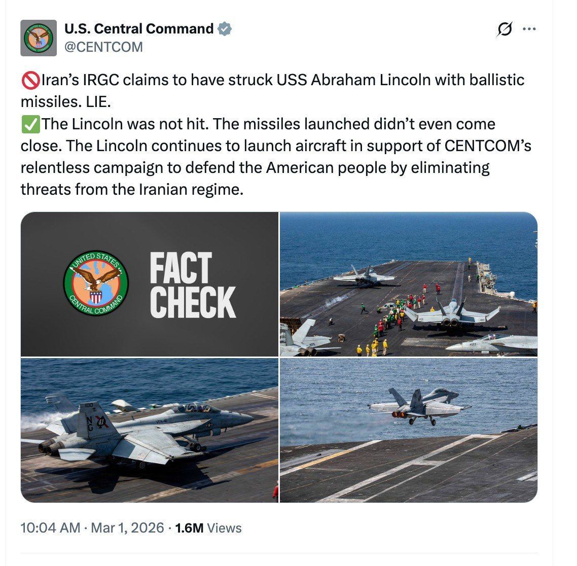 美国中央司令部(CENTCOM)在X平台发帖说,伊朗伊斯兰革命卫队宣称用弹道导弹击中美国海军“亚伯拉罕·林肯”号航空母舰,这是谎言。CENTCOM说,林肯号没有被击中,发射的那枚导弹甚至都没有接近。林肯号继续起飞飞机,支持CENTCOM的不懈行动,通过消除伊朗政权威胁而保卫美国人民。