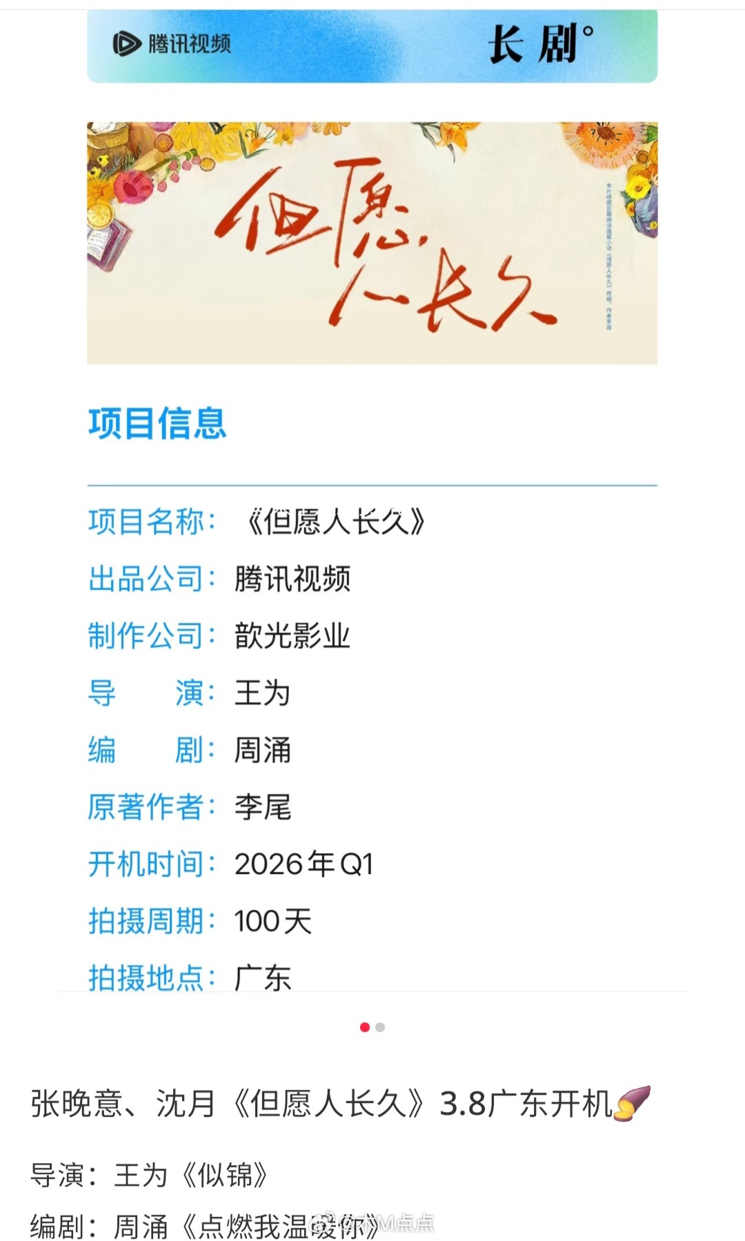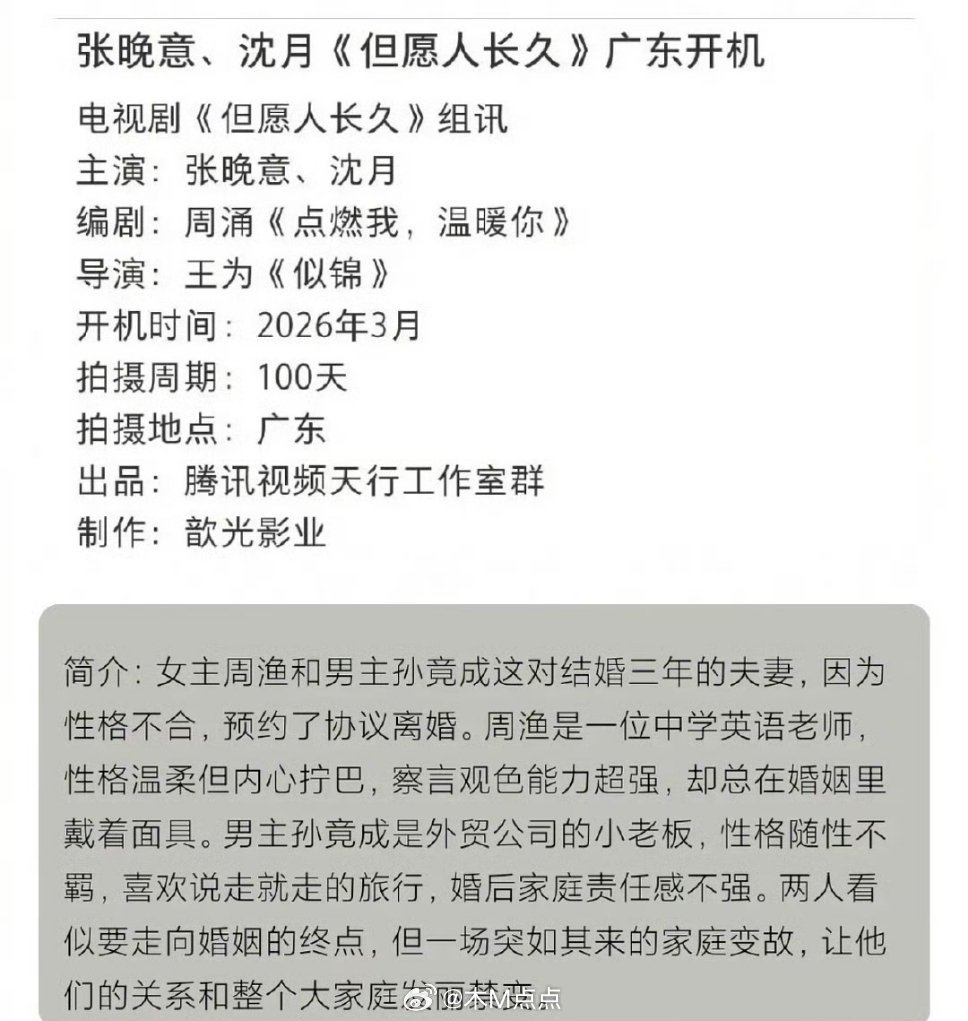 🍉张晚意、沈月《但愿人长久》3月8日开机 中学英语老师和外贸小老板,已婚三年中年夫妻闹离婚的故事…虽然之前很多网友反馈女主选角不合适,但平台还是坚持启动这对组合。。。