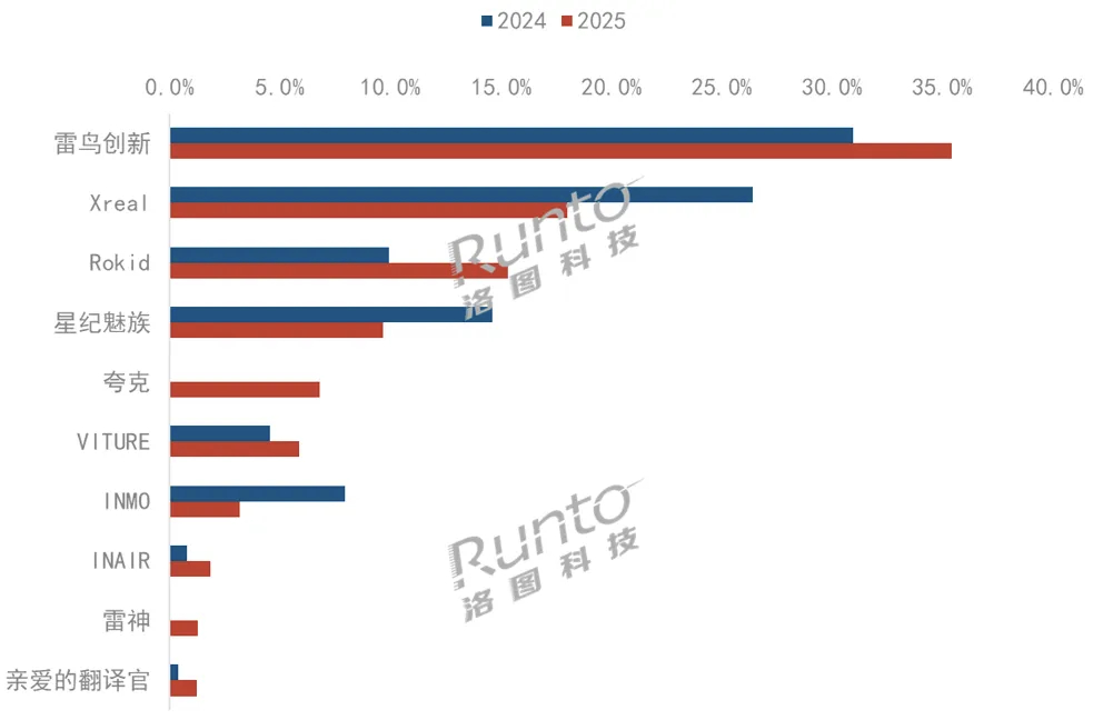 Rokid是2025年的行业黑马,销量占比达到15.3%,较2024年上涨5.4个百分点。