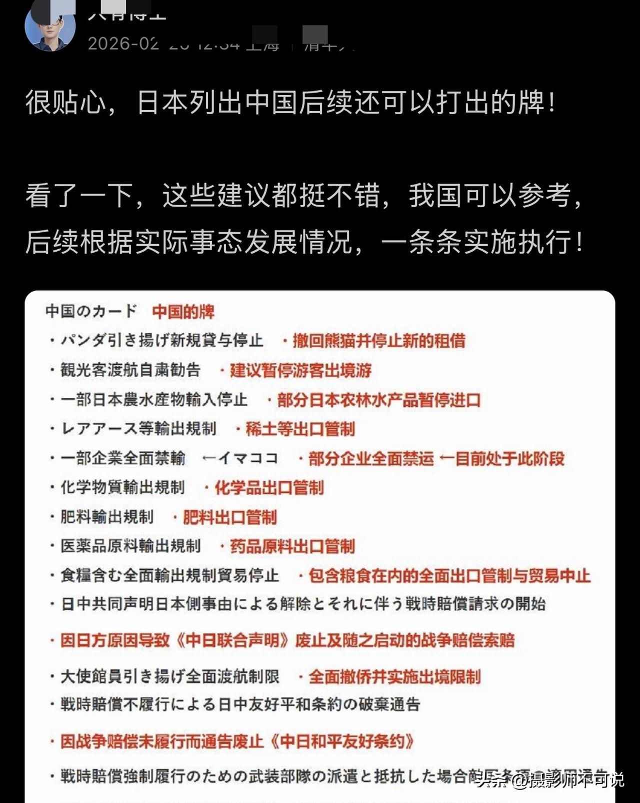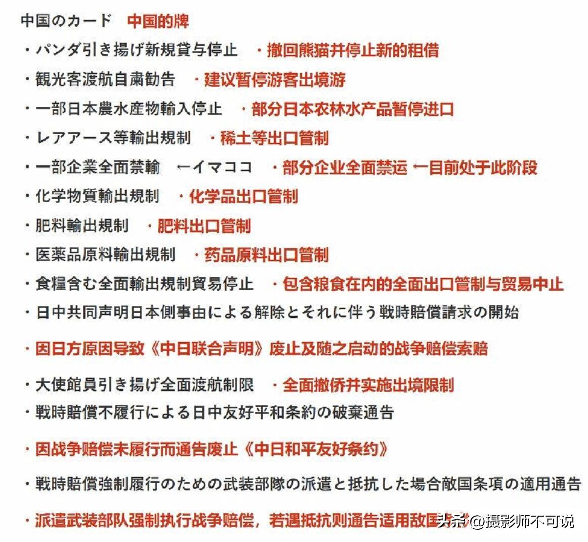有网友用日文写了一段我国对日本还有哪些手段可以用的段子,该段子疑似是出自日本网友的手笔。前面说的几条都是目前已经使用过的了,后面的手段我看了一下,因为我只是一个普通小老百姓,看不懂是肯定的。只是隐约觉得倒数第一二三四条还是很过瘾的,一旦将这四张牌打出来,那场面一定很好看!那么问题来了,假如这真是日本网友的建议,那么它们是否真的害怕这些牌呢?