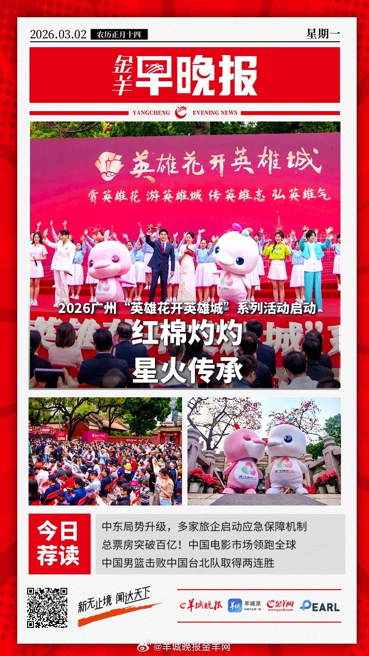 #金羊早晚报# 中东局势升级,同程旅行、去哪儿、广之旅多家旅企启动应急保障机制 油价或出现历史性飙升,后续如何走? 红棉灼灼映百年!2026广州“英雄花开英雄城”系列活动启动 12306短信收不到?要这样设置! 中国海上油田首次实现低空经济规模化应用 “替父请假致其被开除”涉事门店道歉!违法解除劳动合同怎么赔? 男子称托运宠物遭调包,土狗变比格犬!托运公司回应 再度上演大逆转!中国男篮击败中国台北队取得两连胜 丰配友破纪录,中国男子马拉松进入“205”时代 “五羊杯”两位新王诞生!“广州仔”力克越南棋王赖理兄登顶 总票房突破百亿!中国电影市场领跑全球 华南气温持续偏高,降雨频繁有暴雨,并伴强对流天气 伊朗最高领袖哈梅内伊遇害,如何影响局势? 交易商与船商纷纷避开霍尔木兹海峡,国际海运遭遇“急性危机” 印度发生两起爆炸事故造成至少38人丧生 更多精彩报道,请扫码关注羊晚全媒体报道!#演员逼真到根本看不出来是AI##伊朗前总统内贾德遇袭身亡##难怪周杰伦再也没来成都开过演唱会##三甲医生回应秦岚嗓子哑了三年#