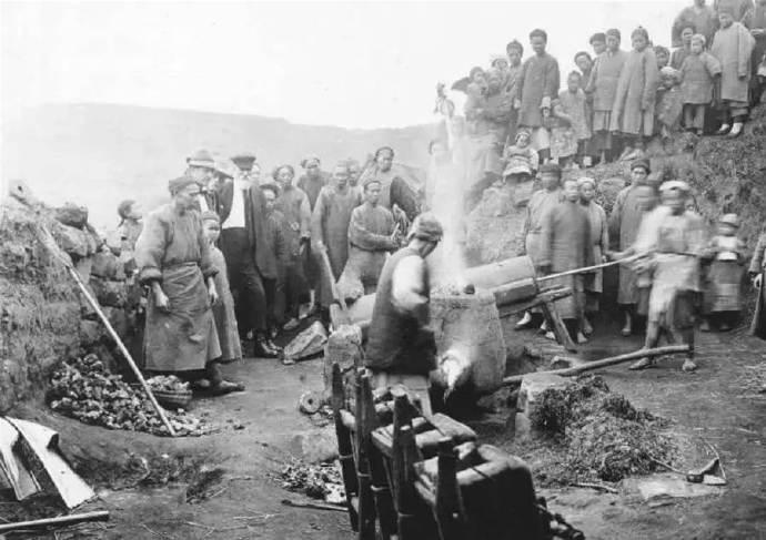 晚清,四川乡间,铁匠师傅赤膊躬身,肌肉线条在火光映照下如他手中锻打的铁料般虬结有力。他双目紧锁砧上通红的铁块,扬起的铁锤在空气中划出无形的轨迹——下一瞬,那千锤百炼的铿锵之音,仿佛就要破开岁月的静默,从照片中迸发出来。 师傅身后,乡民们静静围立。有人背手细观,有人微微前倾,孩童从人缝中探出好奇的目光。这不是表演,而是一场关乎生计的庄严仪式——每一件镰刀、锄头的诞生,都连接着土地下一季的收成。