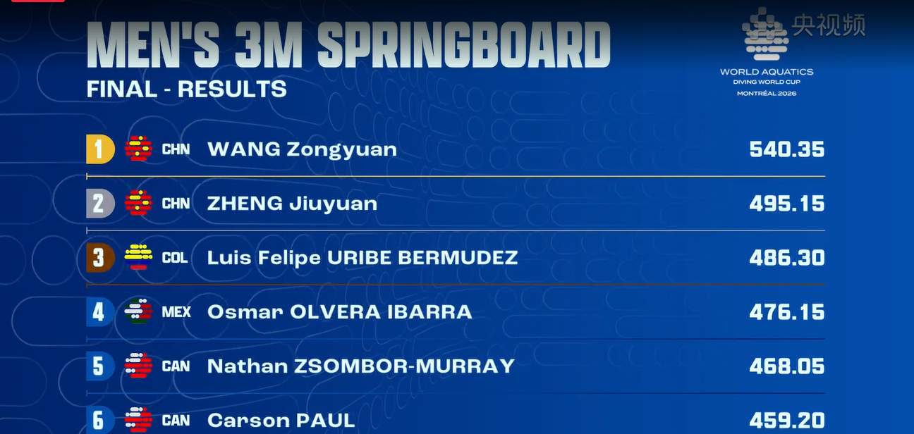 世界泳联跳水世界杯蒙特利尔站最后一项男子3米板,王宗源郑九源包揽冠亚军,中国队9金4银收官