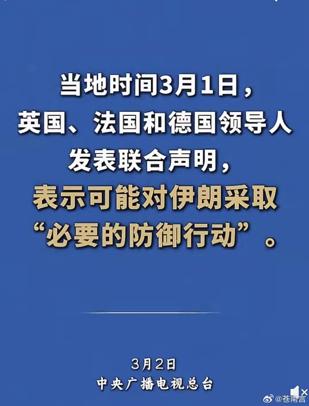 英法德三国联合声明英国、法国和德国领导人发表联合声明,表示可能对伊朗采取“必要的防御行动”。三国领导人已同意与美国和该地区的其他盟友合作。