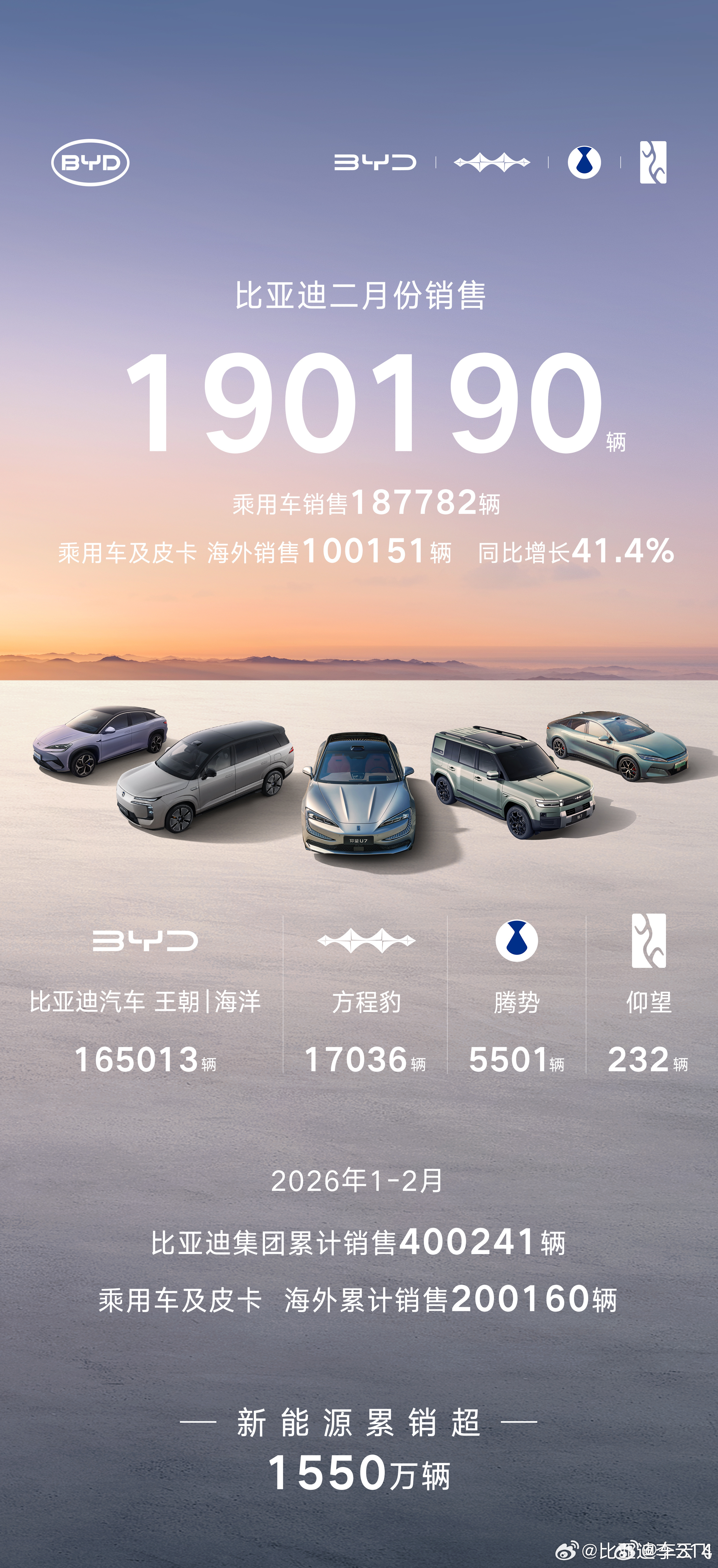 2月,比亚迪的乘用车销量为187782辆,其中王朝与海洋合计165013辆,方程豹17036辆,腾势5501辆,仰望232辆。值得一提的是,乘用车及皮卡海外销售100151辆,出海战略稳步前进;新能源汽车累计销售超1550万辆,依然稳坐国内头把交椅。对于比亚迪来说,自己的基本盘已经足够扎实,接下来不仅要继续稳扎稳打,还要更加细分产品类别,寻求从更多场景、更多角度满足用户需求,在新能源车产业的新一轮争夺中打出自己的差异化优势。比亚迪2月份销量190190辆秦PLUS官宣7年低息夯爆了 比亚迪2月销量 比亚迪