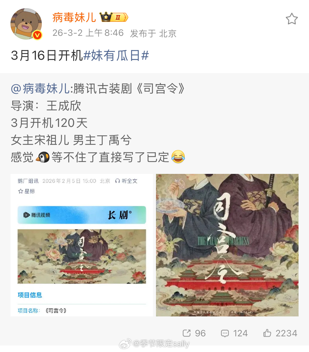 🍉宋祖儿 丁禹兮《司宫令》已定,3.16开机