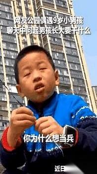 “为中国人民崛起而战!”——这句话,一个九岁的孩子从嘴里说出来,直接把我魂都震飞了!妈呀,我当时刷到这视频的时候,直接就愣住了,心里那叫一个百感交集。 本来以为,又是个什么街头采访,问小屁孩儿长大了想干嘛?无非就是医生、老师、科学家呗,或者现在更流行的,想当网红、赚大钱。对吧?我们这些大人,心里门儿清,也习惯了。结果呢?四川一公园里,一个小男孩,九岁,被问到这个问题,他眼珠子一转,可不是那种油滑的转,是眼里有光的坚定,直接甩出一句:“我觉得我适合当兵,我是个当兵的好苗子。”卧槽,这第一波冲击波就来了!你敢信? 那大人也给问住了,又追一句:“那你知道当兵是为了什么吗?”我心想,这回总该说“保家卫国”这四个字了吧?结果呢,孩子摇摇头,挺着小胸脯,一字一句地蹦出来:“为中国人民崛起而战!” 我的天呐!那一瞬间,我眼眶直接就湿了。不是演的,是那种真真切切被触动到心窝子的感觉。什么叫格局?这就是格局!什么叫少年强?这就是少年强!这孩子,他不是背书,不是大人教的,他那种眼神,那种气势,是骨子里透出来的! 人民日报转发这事儿,还配文“为中华崛起而读书!”简直是点睛之笔!说实话,现在这社会,大家都在忙着挣钱,忙着内卷,忙着焦虑,各种“精致利己”的论调,说得头头是道。突然冒出这么一个九岁的孩子,他眼睛里看到的是国家,是人民,他想的不是自己能得到什么,而是要付出什么,要守护什么! 这哪是空话啊?这就是最朴素、最震撼人心的情怀!那些说现在孩子是“温室花朵”的,我看这四川小伙子直接就给你们上了一课。他让我们看到了,那股子劲儿,那股子心气儿,还在!根本没断过! 所以啊,别老觉得年轻人垮了,别老觉得希望没了。看看这孩子,再想想咱们自己,有时候是不是把很多东西想得太复杂、太功利了?这孩子用最简单、最直接的回答,扇了多少“聪明人”的耳光? 真好!这才是我们中国孩子该有的样子!不浮躁,不功利,心里装着大大的世界!希望这颗小小的种子,能一直这样纯粹地长下去,长成参天大树,撑起未来的一片天!